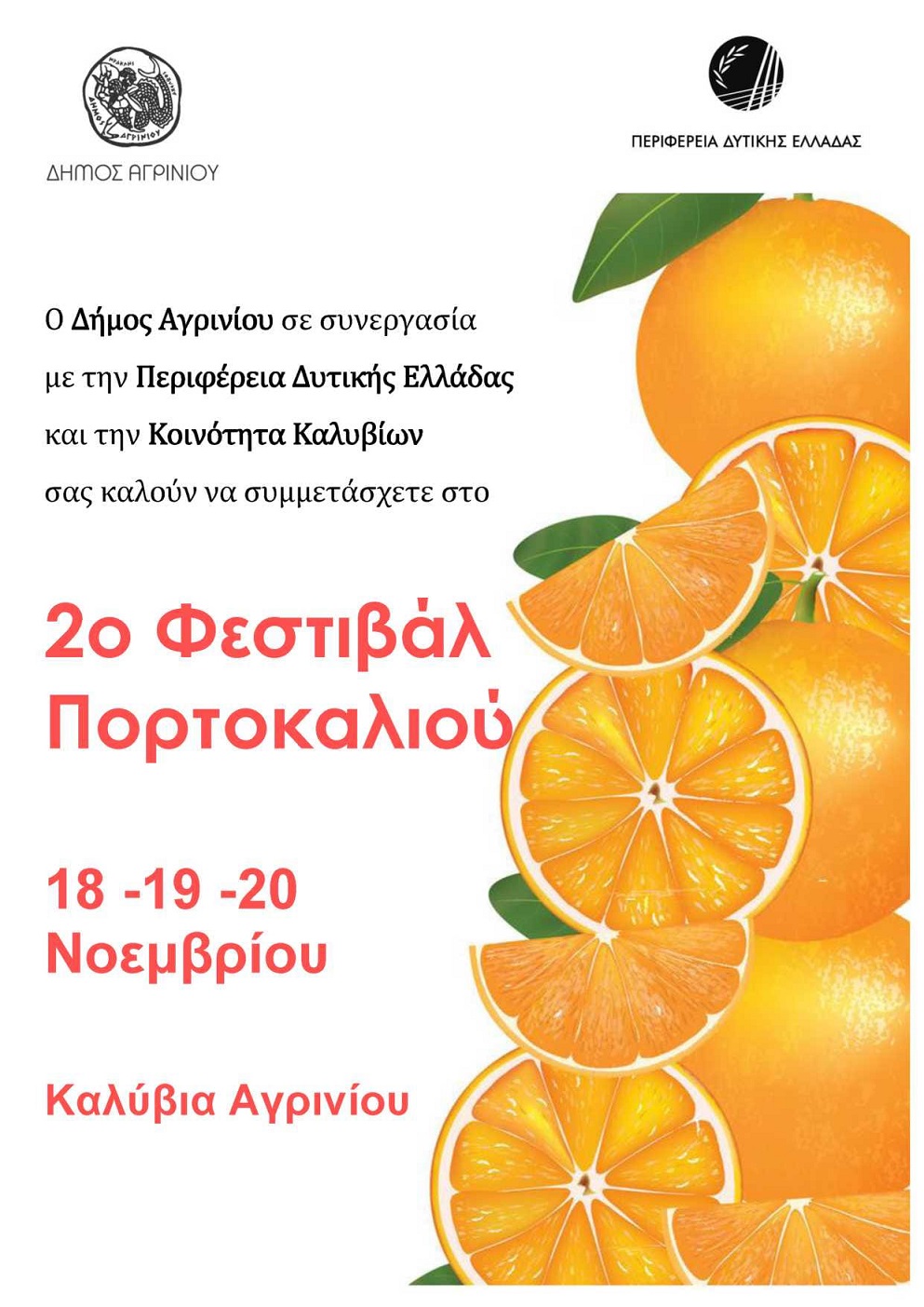 Ο Δήμος Αγρινίου σε συνεργασία με την Περιφέρεια Δυτικής Ελλάδας και την Κοινότητα Καλυβίων διοργανώνουν το «2ο Φεστιβάλ Πορτοκαλιού» από 18 έως 20 Νοεμβρίου 2022.