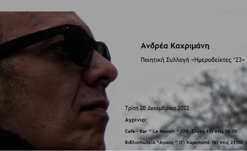 Παρουσίαση της ποιητικής συλλογής με τίτλο «Ημεροδείκτες ‘23» του πολυσχιδή καλλιτέχνη και ποιητή Ανδρέα Καχριμάνη, θα παρουσιαστεί στο κοινό την Τρίτη 20 Δεκεμβρίου, σε 2 διαφορετικούς χώρους στο Αγρίνιο: Στο Cafe – Bar “ Le Manoir “ (Οδ. Ελύτη 11) στις 16:00 μ.μ. και στο Βιβλιοπωλείο “Αγαύη ” (Γ. Καραπαπά 16) στις 21:00 μ.μ.