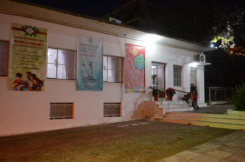 Τον Αγιασμό των Εγκαινίων τέλεσε το απόγευμα της Τρίτης 20 Δεκεμβρίου ο Σεβασμιώτατος Μητροπολίτης κ. Δαμασκηνός, ο οποίος κατά την σύντομη ομιλία του, συνεχάρη τον Υπεύθυνο του Βιβλιοπωλείου, αρχιμ. Ιωσήφ Ζωγράφο, Καθηγούμενο της Ιεράς Μονής Μυρτιάς και τους συνεργάτες του για την προετοιμασία και την όμορφη παρουσίαση της Έκθεσης και τόνισε ότι η εορταστική περίοδος των Χριστουγέννων χαρακτηρίζεται από την προσφορά και την ανταλλαγή δώρων.