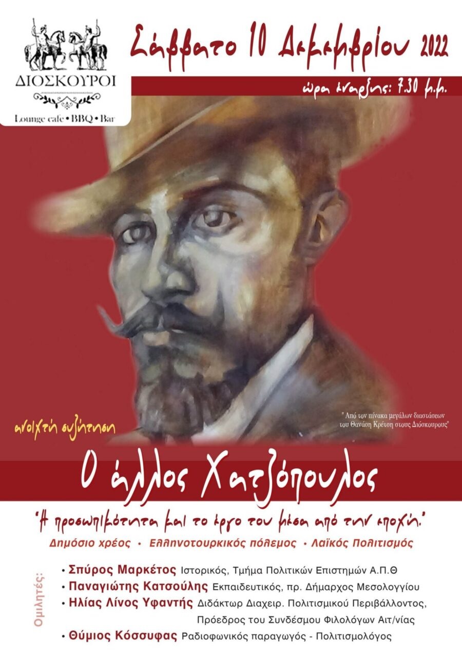 Ανοιχτή συζήτηση με τίτλο, «ο Άλλος Χατζόπουλος – Η προσωπικότητα και το έργο του μέσα από την εποχή – Δημόσιο χρέος, Ελληνοτουρκικός πόλεμος, Λαϊκός Πολιτισμός» διοργανώνει την Κυριακή, 8 Ιανουαρίου 2023, στις 19.30 μ.μ. τo café ¨Διόσκουροι¨ (α΄ πάροδος Μεσολογγίου 1) στο Αγρίνιο.