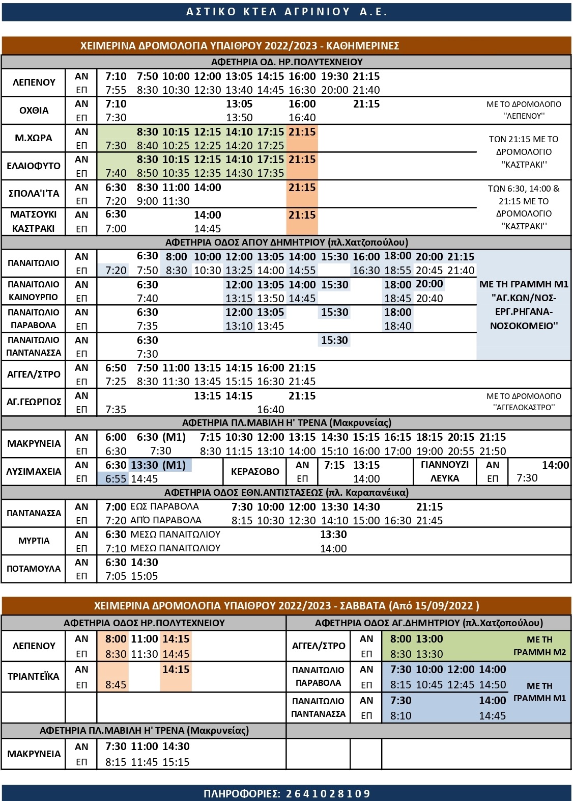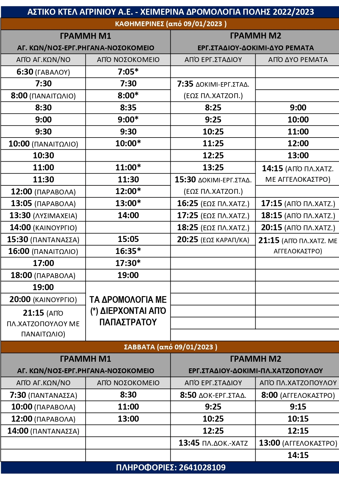 Από την Δευτέρα 09/01/2023 θα ισχύουν τα κάτωθι χειμερινά δρομολόγια πόλης Αγρινίου και υπαίθρου, για το επιβατηκό κοινό, όπως ανακοινώθηκαν από το Αστικό ΚΤΕΛ Αγρινίου. Πιο συγκεκριμένα: