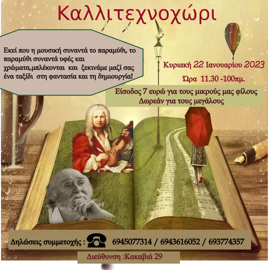 Το "Καλλιτεχνοχώρι", στην προσπάθειά του να φέρει πιο κοντά το παιδί και το βιβλίο, στην μουσική, στην ζωγραφική, ανοίγει τις πόρτες του σε μουσικά παραμύθια και τραγούδια, όπου με την κα Τσιρώνη Μαρία, Μουσικό εκπαιδευτικό -Εμψυχώτρια θεατρικής Αγωγής, την κα Κατερίνα Μπιλίνη, Εικαστικό και τον κ.Ανδρέα Φούκα, Μουσικό, μία φορά το μήνα, θα παρουσιάζει ένα μουσικό παραμύθι με αφήγηση, θεατρικό παιχνίδι, γνωριμία μ΄έναν ζωγράφο και τραγούδι, με συμμετοχή των παιδιών.