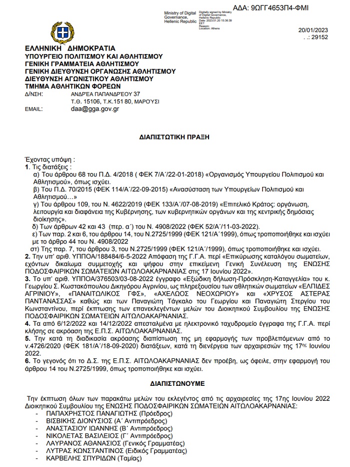 Το υπ’ αριθ. ΥΠΠΟΑ/376503/03-08-2022 έγγραφο «Εξώδικη δήλωση-Πρόσκληση-Καταγγελία» του κ. Γεωργίου Σ. Κωστακόπουλου Δικηγόρου Αγρινίου, ως πληρεξουσίου των αθλητικών σωματείων «ΕΛΠΙΔΕΣ ΑΓΡΙΝΙΟΥ», «ΠΑΝΑΙΤΩΛΙΚΟΣ ΓΦΣ», «ΑΧΕΛΩΟΣ ΝΕΟΧΩΡΙΟΥ» και «ΧΡΥΣΟΣ ΑΣΤΕΡΑΣ ΠΑΝΤΑΝΑΣΣΑΣ» καθώς και των Παναγιώτη Τάγκαλο του Γεωργίου και Παναγιώτη Στεργίου του Κωνσταντίνου, περί έκπτωσης των επανεκλεγέντων μελών του Διοικητικού Συμβουλίου της ΕΝΩΣΗΣ ΠΟΔΟΣΦΑΙΡΙΚΩΝ ΣΩΜΑΤΕΙΩΝ ΑΙΤΩΛΟΑΚΑΡΝΑΝΙΑΣ.