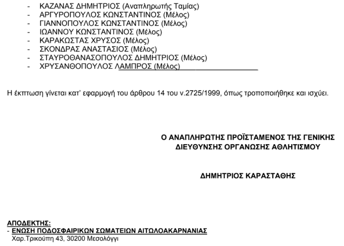Αναλυτικά η σημερινή απόφαση με την οποία κηρύχθηκε έκπτωτη η διοίκηση της ΕΠΣ Αιτωλοακαρνανίας: