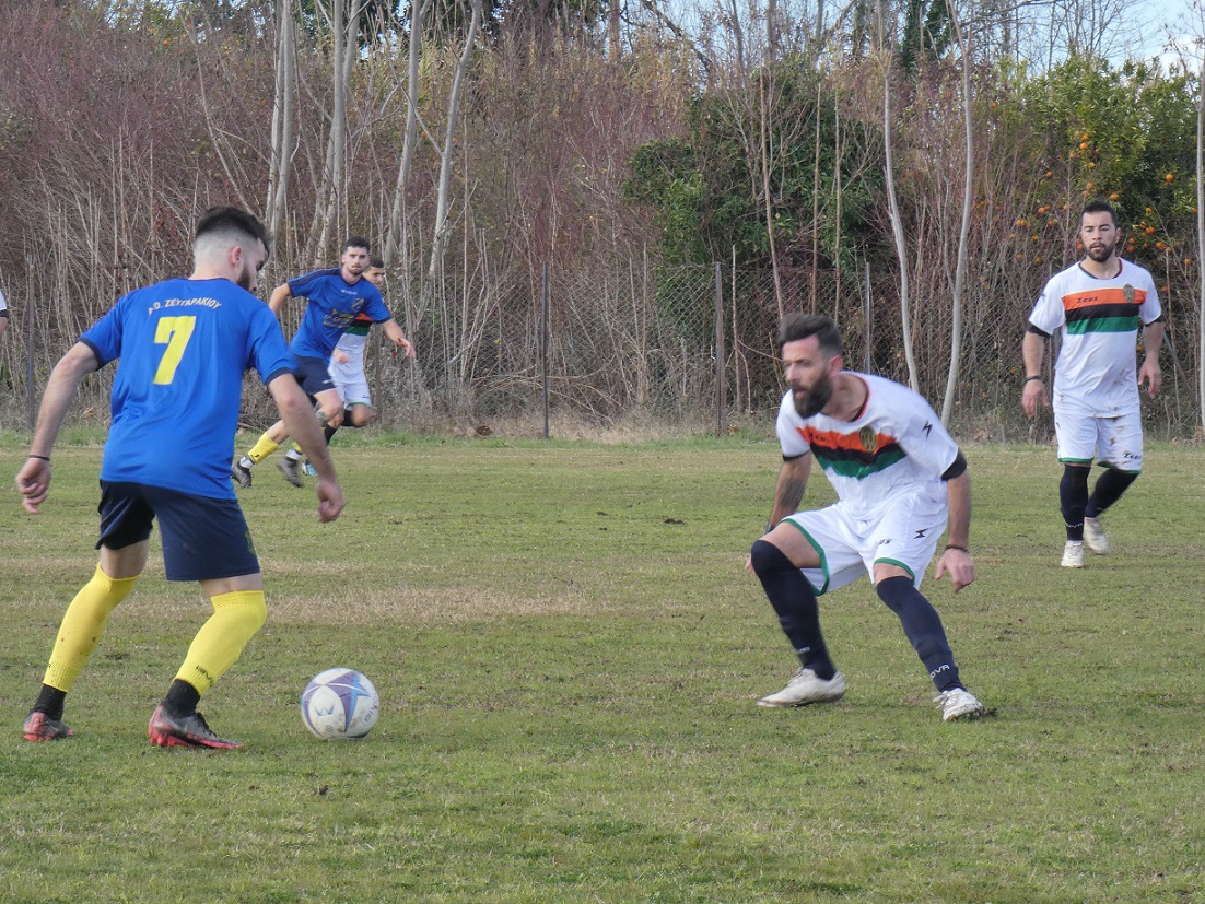 Στο αγωνιστικό μέρος του παιχνιδιού, που διεξήχθη στα πλαίσια της 9ης αγωνιστικής του πρωταθλήματος της Β΄ Κατηγορίας της ΕΠΣ Αιτωλ/νίας, η ομάδα του ΑΟ Ζευγαρακίου μπήκε δυνατά στο παιχνίδι και προηγήθηκε στο πρώτο 15λεπτο με δυο τέρματα των Κατσαβοχρήστου και Πελεκάνου, αιφνιδιάζοντας τους γηπεδούχους. Ένα εξαίσιο κτύπημα φάουλ από τον Π. Καρύμπα, η μπάλα βρήκε το κάθετο δοκάρι ¨και κάποια σουτ, ήταν η ¨απάντηση των Καλυβιωτών, οι οποίοι κατάφεραν να ισορροπήσουν το παιχνίδι τους αλλά δεν μπόρεσαν να βρουν λύσεις για το διάστημα που διήρκησε ο αγώνας.