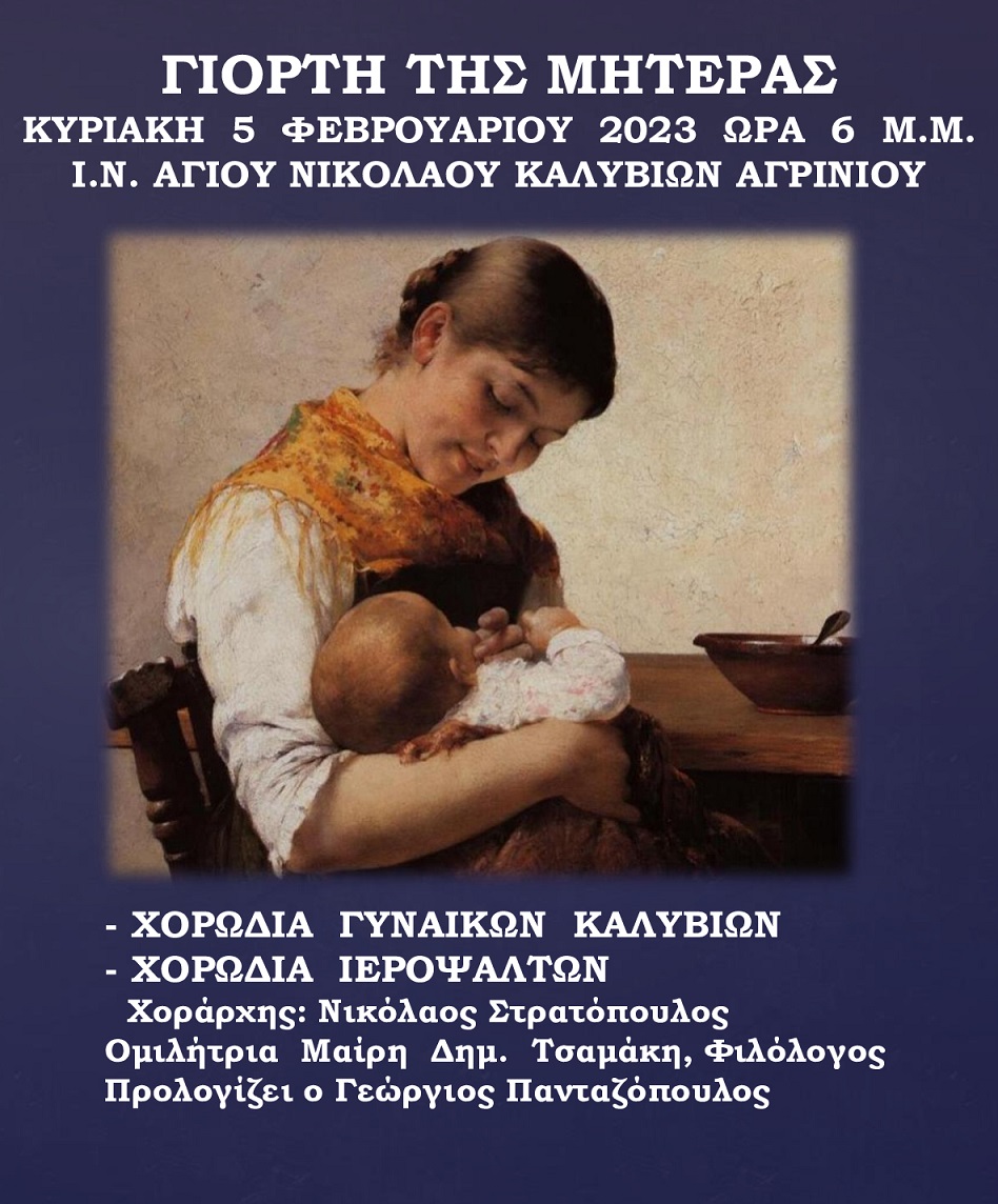 Η Χορωδία Γυναικών Καλυβίων, διοργανώνει εκδήλωση αφιερωμένη στην Υπαπαντή Του Κυρίου και την Γιορτή της Μητέρας, η οποία θα πραγματοποιηθεί την προσεχή Κυριακή 5 Φεβρουάριου 2023 και ώρα 6 μ.μ. στον Ιερό Ναό Αγίου Νικολάου Καλυβίων Αγρινίου.