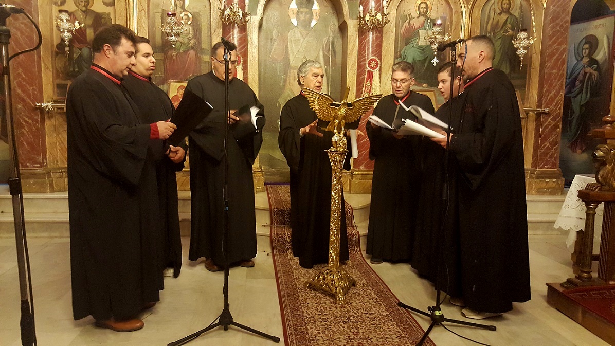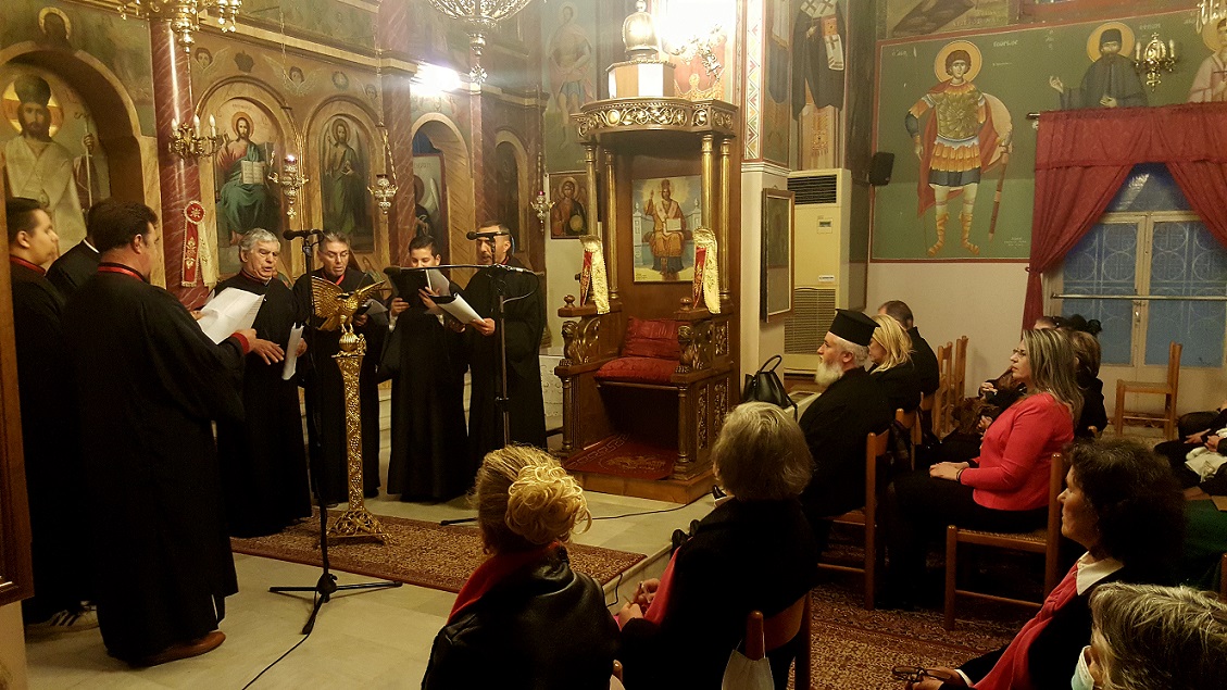 Στην αρχή του προγράμματος οι Ιεροψάλτες του Ι.Ν. Αγίου Νικολάου Καλυβίων έψαλλαν εκκλησιαστικούς ύμνους για την Εορτή της Υπαπαντής, υπό την διεύθυνση του κ. Νικόλαου Στρατόπουλου.