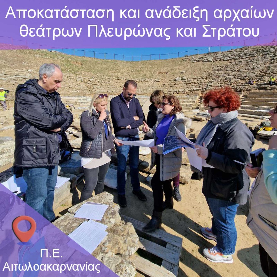 Τα Αρχαία Θέατρα Στράτου και Πλευρώνας στην Αιτωλοακαρνανία επισκέφθηκε σήμερα, Τρίτη 21 Φεβρουαρίου, ο Περιφερειάρχης, Νεκτάριος Φαρμάκης, προκειμένου να ενημερωθεί για την πορεία των εργασιών στερέωσης, αποκατάστασης και ανάδειξης των μνημείων που χρηματοδοτούνται από την Περιφέρεια Δυτικής Ελλάδας, καθώς τα έργα είναι ενταγμένα στο Επιχειρησιακό Πρόγραμμα «Δυτική Ελλάδα 2014-2020».