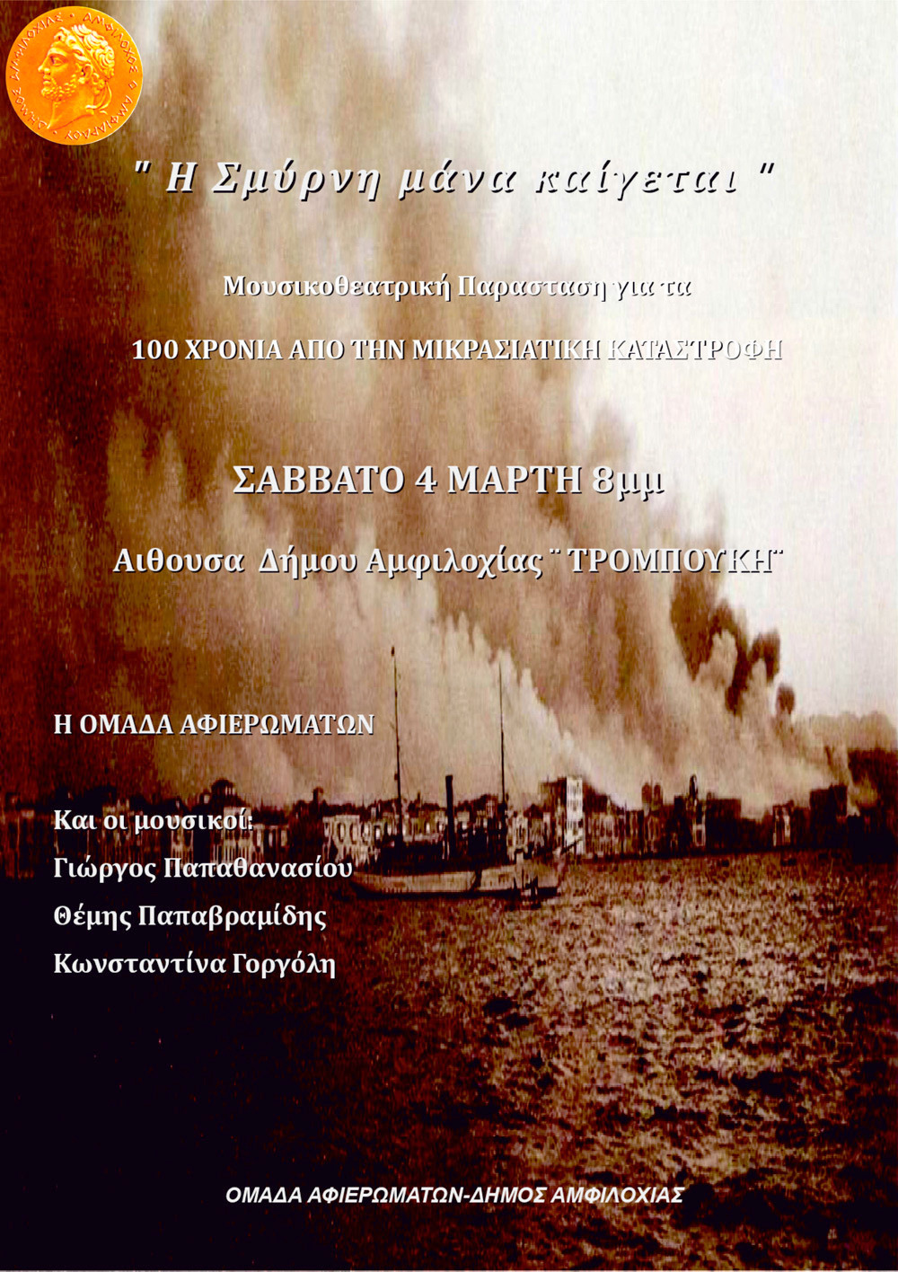 Ο Δήμος Αμφιλοχίας και η «Ομάδα Αφιερωμάτων» σας προσκαλούν στη μουσικοθεατρική παράσταση για τα 100 χρόνια από τη Μικρασιατική Καταστροφή «Η Σμύρνη μάνα καίγεται», το Σάββατο 4 Μαρτίου 2023 στις 20:00 στην αίθουσα «Τρομπούκη» στην Αμφιλοχία.