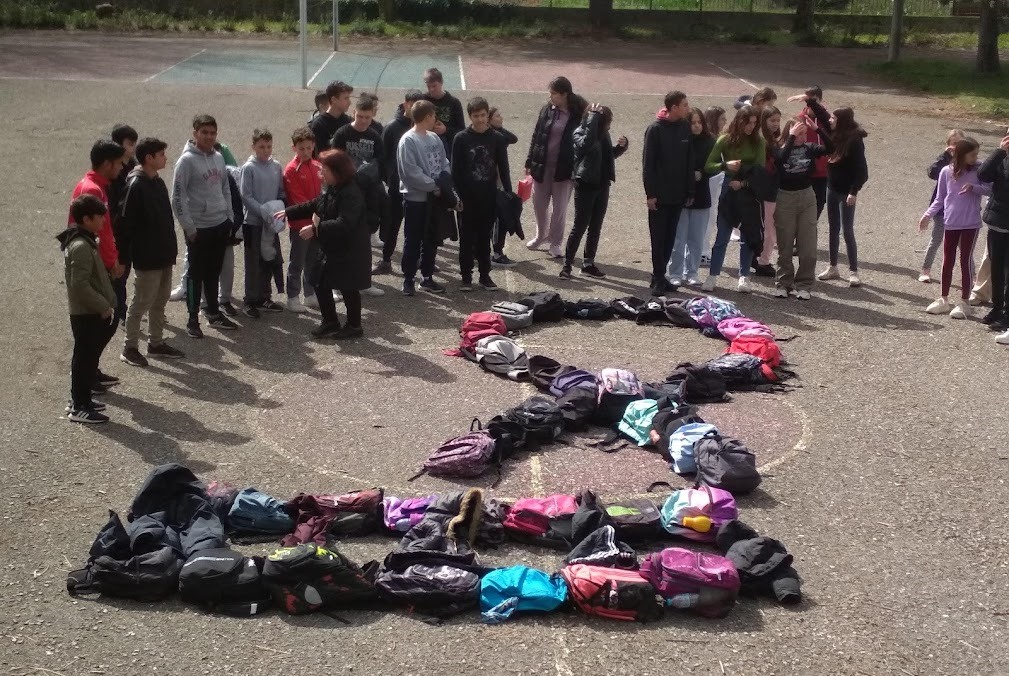 Με μια συμβολικού χαρακτήρα κίνηση, οι μαθητές και οι μαθήτριες του Γυμνασίου Καλυβίων τίμησαν σήμερα, με το σχηματισμό του πένθους με τις σχολικές τσάντες τους και τηρώντας ενός λεπτού σιγής, την μνήμη των άδικα χαμένων θυμάτων στην σιδηροδρομική τραγωδία των Τεμπών.