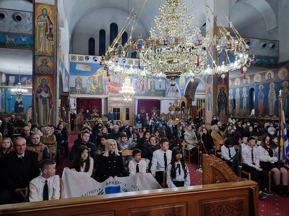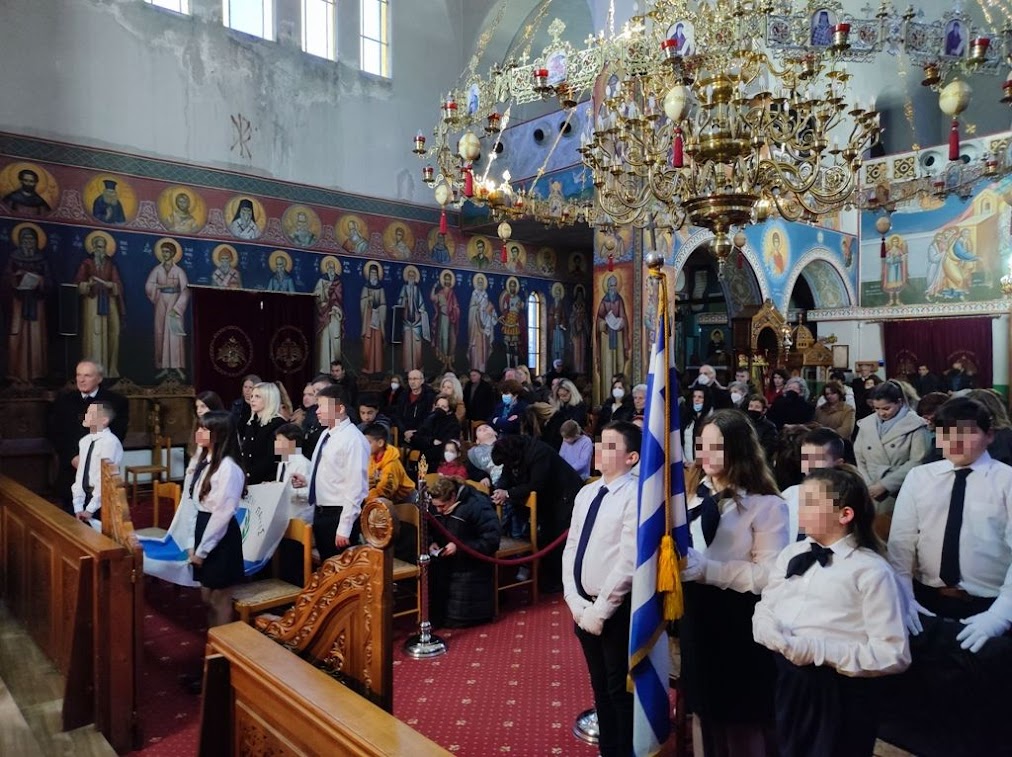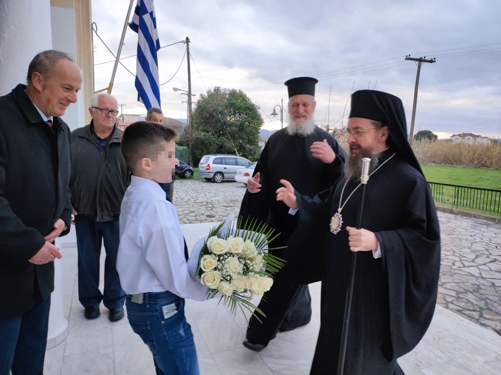 Στην είσοδο του Ναού τον υποδέχθηκαν θερμά οι κάτοικοι του χωριού και οι μαθητές της Στ’ τάξης του Δημοτικού Σχολείου, μαζί με τον Διευθυντή κ. Βασίλειο Κόκοτο και τους δασκάλους τους.