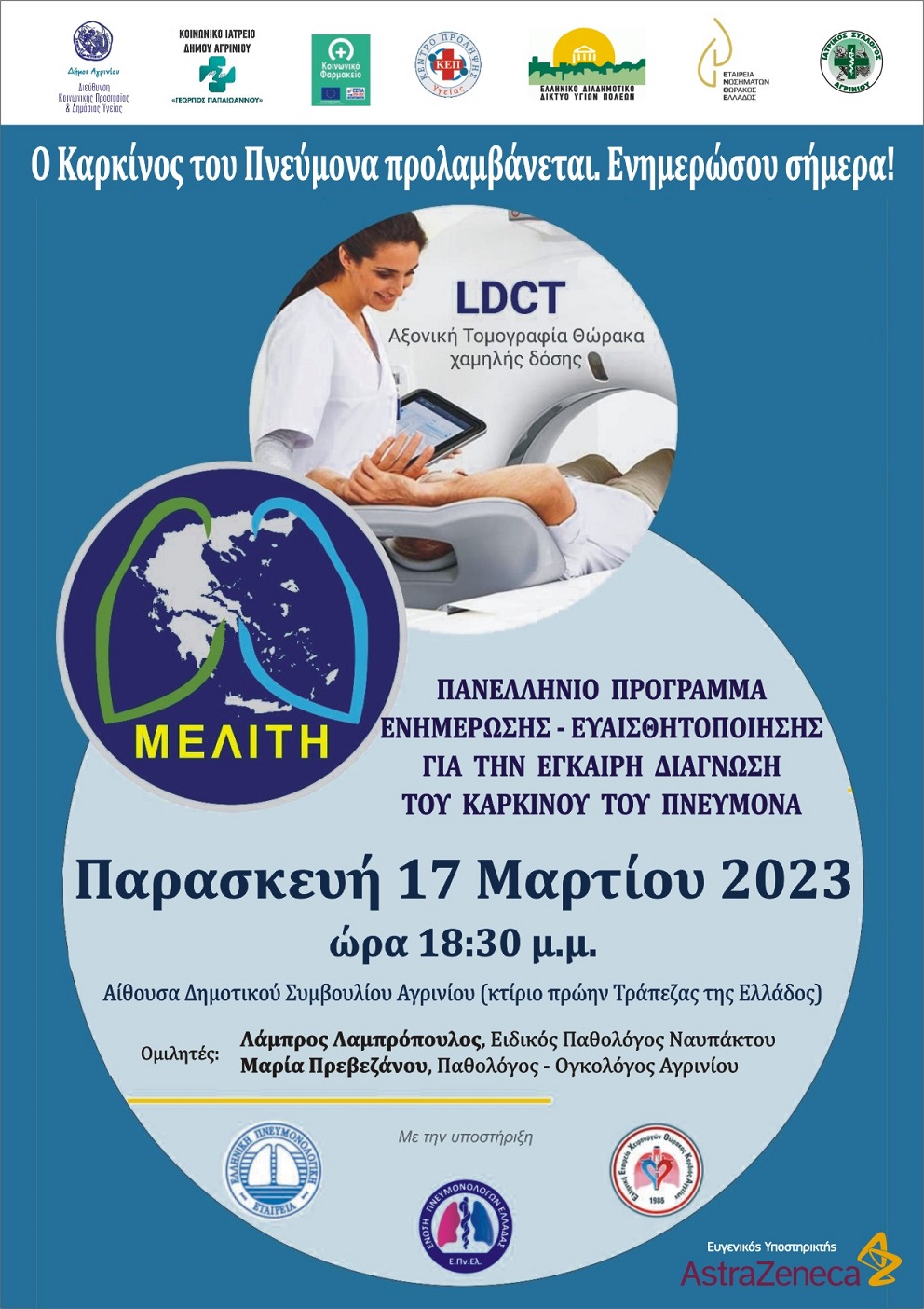 Το Ελληνικό Διαδημοτικό Δίκτυο Υγιών Πόλεων του Π.Ο.Υ, μέλος του οποίου είναι ο Δήμος Αγρινίου, σε συνεργασία με την Εταιρεία Νοσημάτων Θώρακος Ελλάδας – ΕΝΘΕ, ξεκίνησε στους Δήμους - μέλη του Δικτύου, πανελλήνιο Πρόγραμμα ενημέρωσης και ευαισθητοποίησης του πολίτη για την αξία της πρώιμης διάγνωσης του ΚτΠ με τον διακριτικό τίτλο «ΜΕΛΙΤΗ».