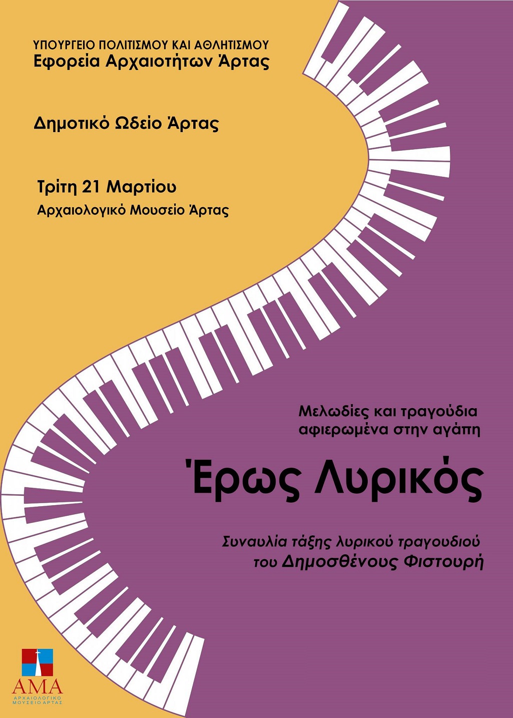 Η Εφορεία Αρχαιοτήτων Άρτας και το Δημοτικό Ωδείο Άρτας στην πρώτη τους συνεργασία διοργάνωσαν μουσική βραδιά με τίτλο «Έρως Λυρικός», που ήταν αφιερωμένη στην αγάπη, τον έρωτα και τη γυναίκα.