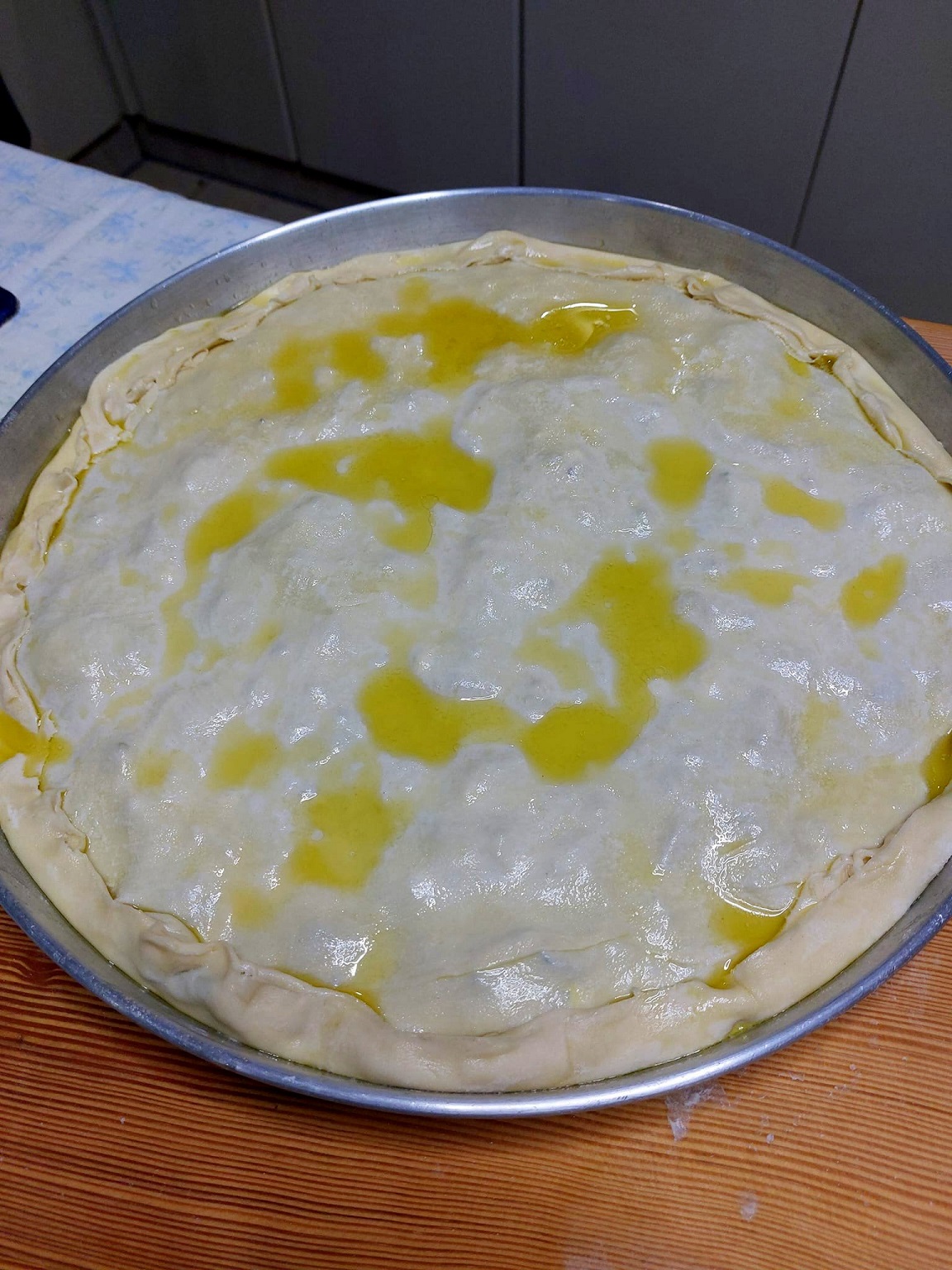 Όταν ροδίσει, για να γυρίσουμε την πίτα, σκεπάζουμε το ταψί, μ᾿ ένα μεγαλύτερο και τ᾿ αναποδογυρίζουμε. Μ᾿ ένα πιρούνι, (προσεκτικά γιατί καίει), βγάζουμε το μικρότερο ταψί.