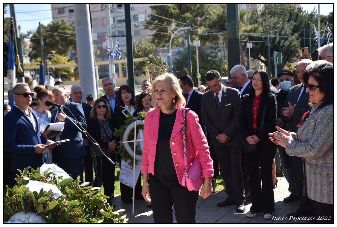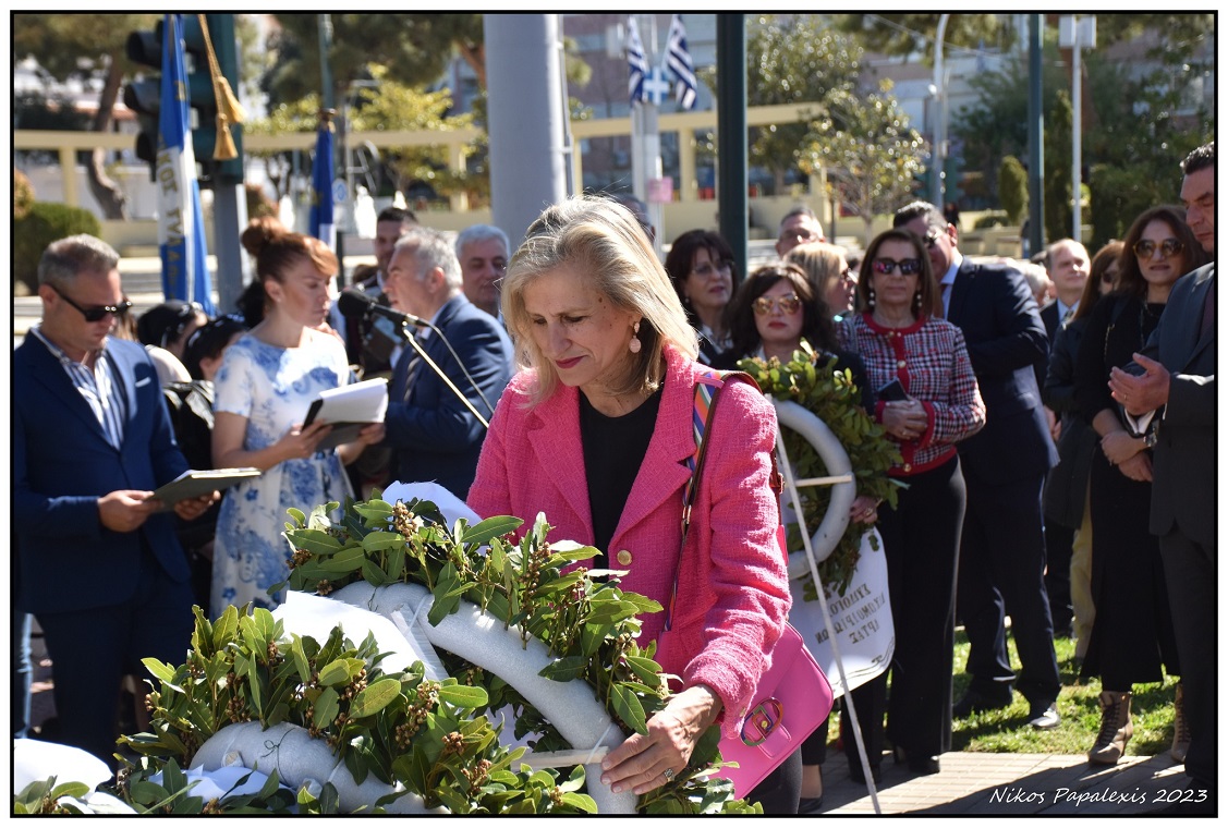 Δάφνινο στεφάνι στη μνήμη των ηρώων κατέθεσε στην προτομή του Κωστή Παλαμά, η Πρόεδρος του συλλόγου Σταμνάς Μεσολογγίου, κα Γεωργία Κορδόση.