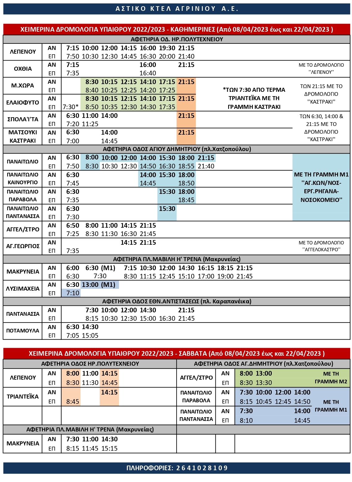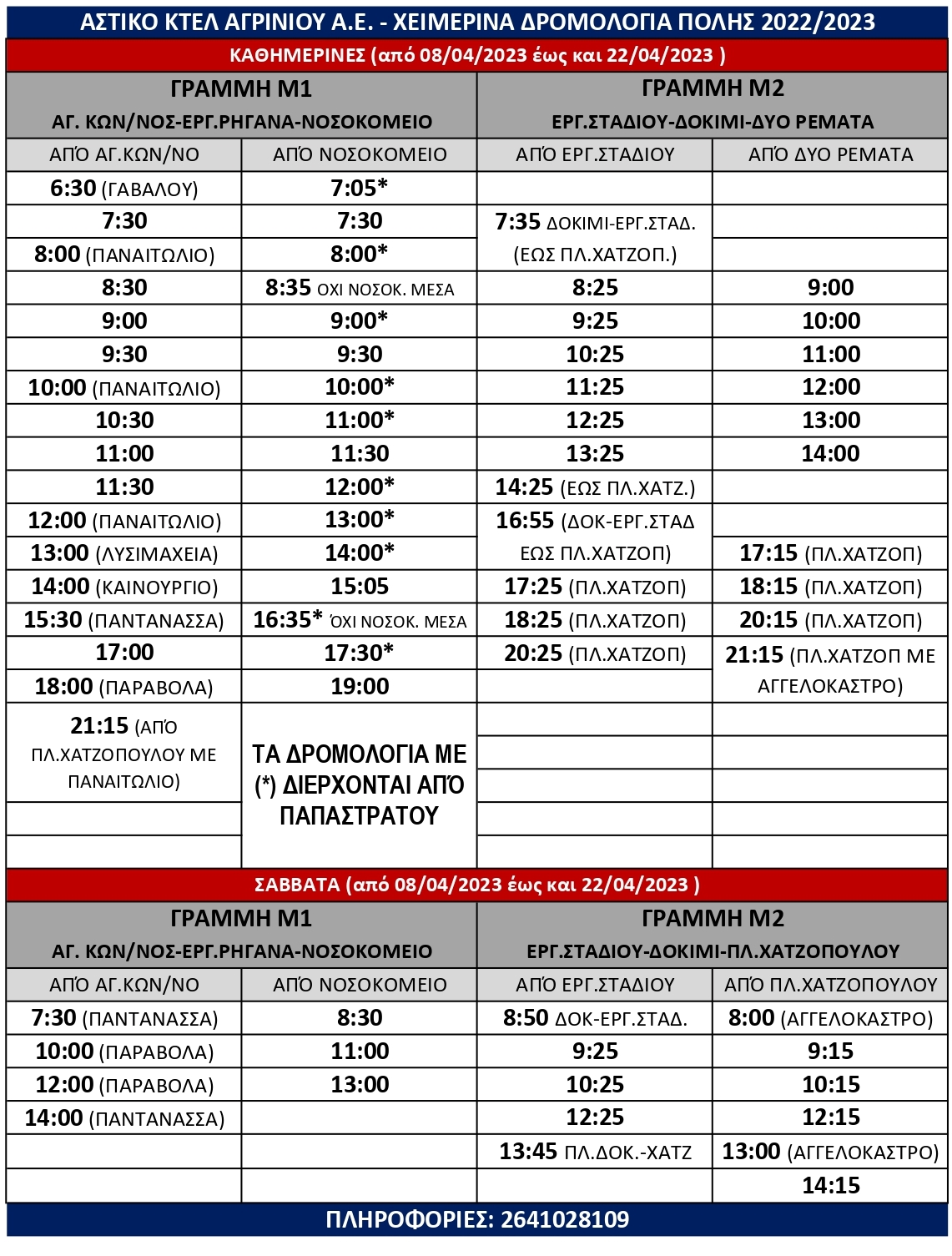 Όπως ανακοινώθηκε από το Αστικό ΚΤΕΛ Αγρινίου, από το Σάββατο 08/04/2023 έως και το Σάββατο 22/04/2023 θα ισχύουν τα κάτωθι δρομολόγια πόλης και υπαίθρου, για την περίοδο της Μ. Εβδομάδας και του Πάσχα. Για την Μ. Πέμπτη και την Μ. Παρασκευή θα βγει νέα ανακοίνωση.