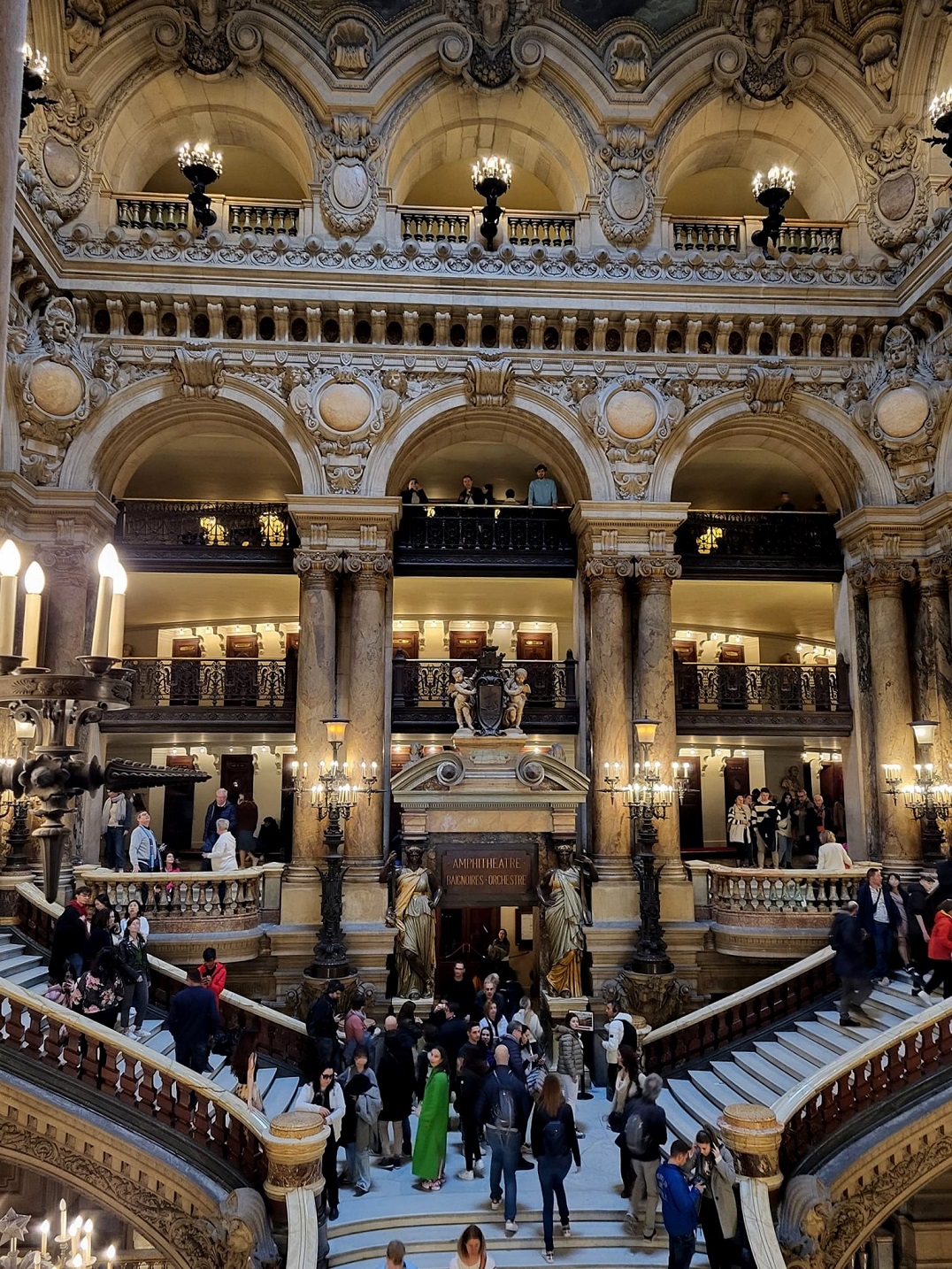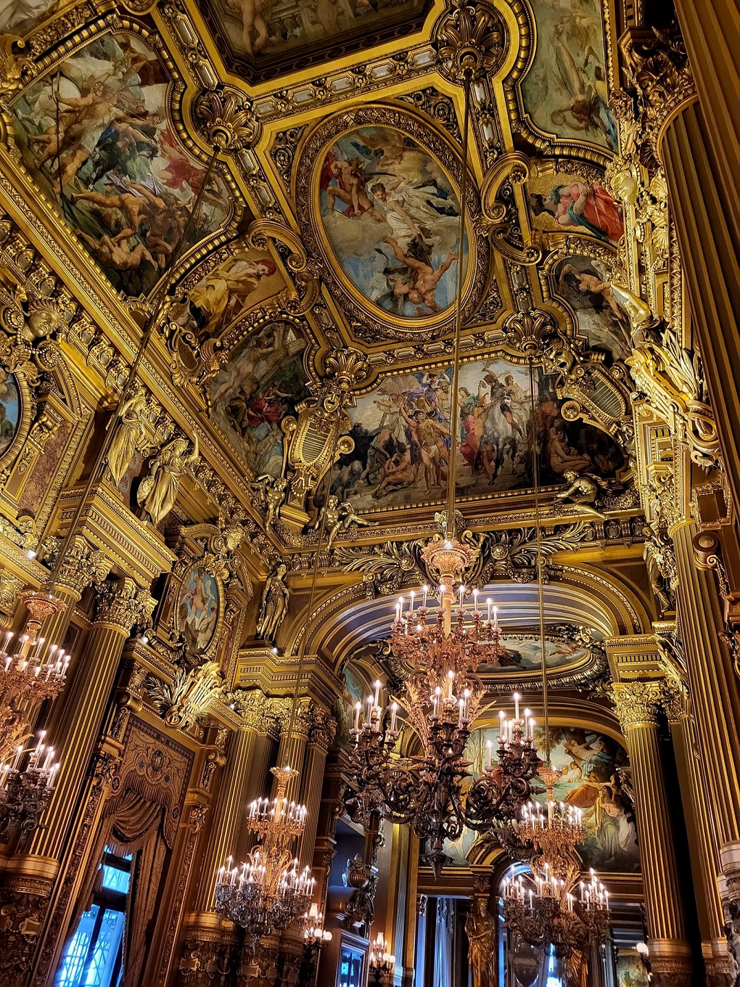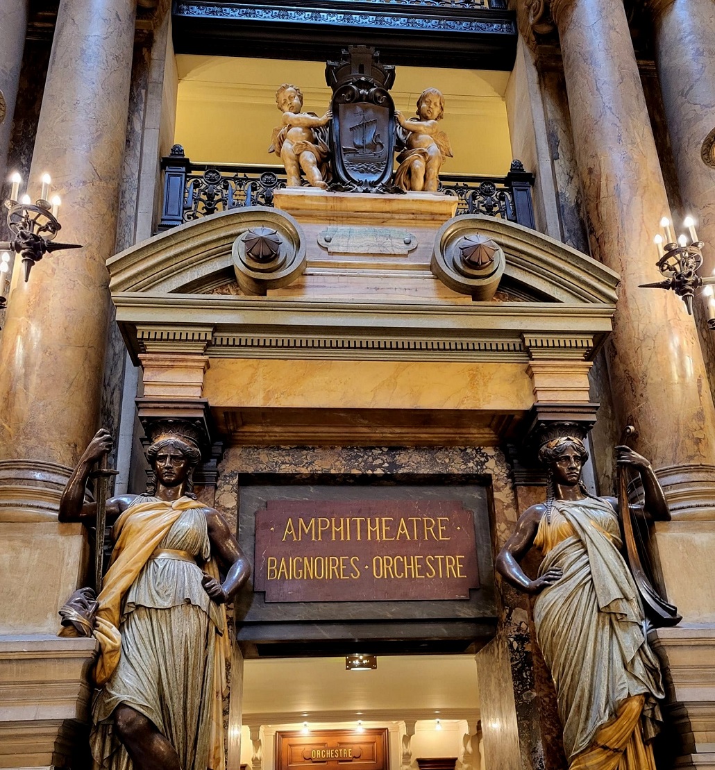Την δεύτερη μέρα είχαμε δυο προγραμματισμένες επισκέψεις, στην Όπερα Γκαρνιέ και μετά στο Μουσείο του Λούβρου. Ξεκινήσαμε με Όπερα, το Πάλε Γκαρνιέ είναι μία όπερα 1979 θέσεων, πού κτίστηκε το 1875, προορισμένη να γίνει η κεντρική όπερα του Παρισιού, όπου φυσικά δεν θα μπορούσε να λείπει το Ελληνικό στοιχείο. Στις κεντρικές κολώνες στο εσωτερικό του κτιρίου είναι γραμμένα στα Ελληνικά, αρκετά ονόματα κρατών όπως (Ιταλία, Γαλλία, Ελλάδα, Αίγυπτος κ.ά.)