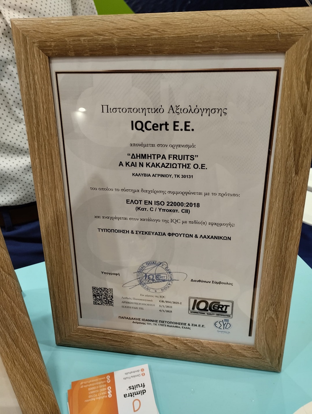 Ανταποκρινόμενοι στις απαιτήσεις της σύγχρονης επιχειρηματικής πραγματικότητας και με στόχο πάντα την ταχύτερη και καλύτερη εξυπηρέτηση των πελατών της, η επιχείρησή "Dimitra Fruits" διαθέτει πιστοποίηση ISO για την ασφάλεια τροφίμων & για τη διαχείριση της ποιότητας. Έτσι διασφαλίζεται στο καταναλωτικό κοινό η προσφορά προϊόντων σταθερά υψηλής ποιότητας και διατροφικής αξίας.