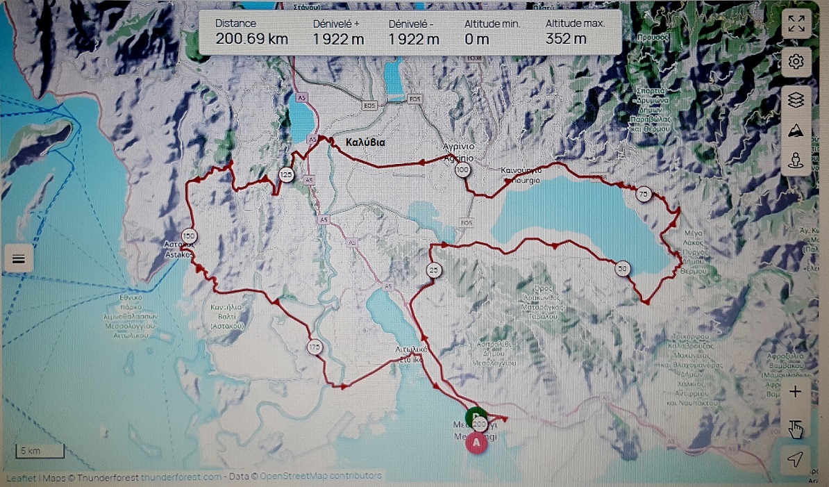 Με βάση τον σχεδιασμό της διαδρομής του μπρεβέ, η εκκίνηση και τερματισμός θα γίνουν στο Μεσολόγγι, ενώ θα περάσουν από Θέρμο, Αγρίνιο, Αστακό και Αιτωλικό. Να σημειώσουμε ότι, οι ποδηλάτες θα διέλθουν από το Αγρίνιο και στα φανάρια του Αγ. Δημητρίου θα στρίψουν αριστερά, προς Δοκίμι, για να ακολουθήσουν πορεία προς το χωριό Καλύβια στο 110ο χλμ. όπου στη διασταύρωση (μικρή πλατεία), θα υπάρχει Chek in και σταθμός τροφοδοσίας.