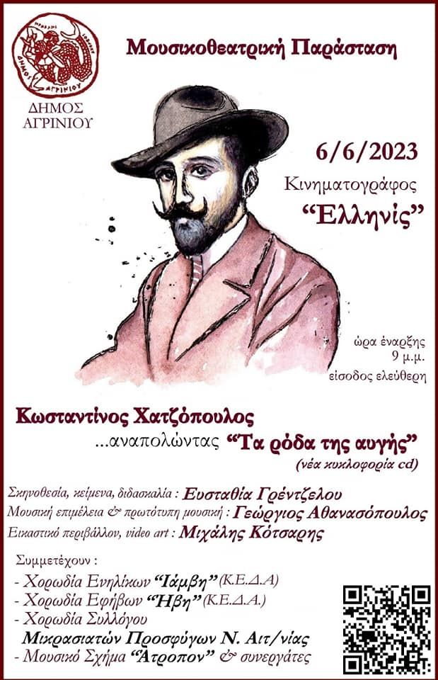 Το Τμήμα Παραδοσιακής Μουσικής του Δήμου Αγρινίου, στα πλαίσια της νέας δισκογραφικής δουλειάς με μελοποιημένη ποίηση του Κ. Χατζόπουλου, που υπογράφουν οι Ευσταθία Γρέντζελου και Γεώργιος Αθανασόπουλος ανεβάζει μουσικοθεατρική παράσταση με τίτλο «Κωσταντίνος Χατζόπουλος... αναπολώντας τα ρόδα της αυγής» την Τρίτη 6 Ιουνίου 2023 στις 9 μ.μ. στο Σινε "Ελληνίς".