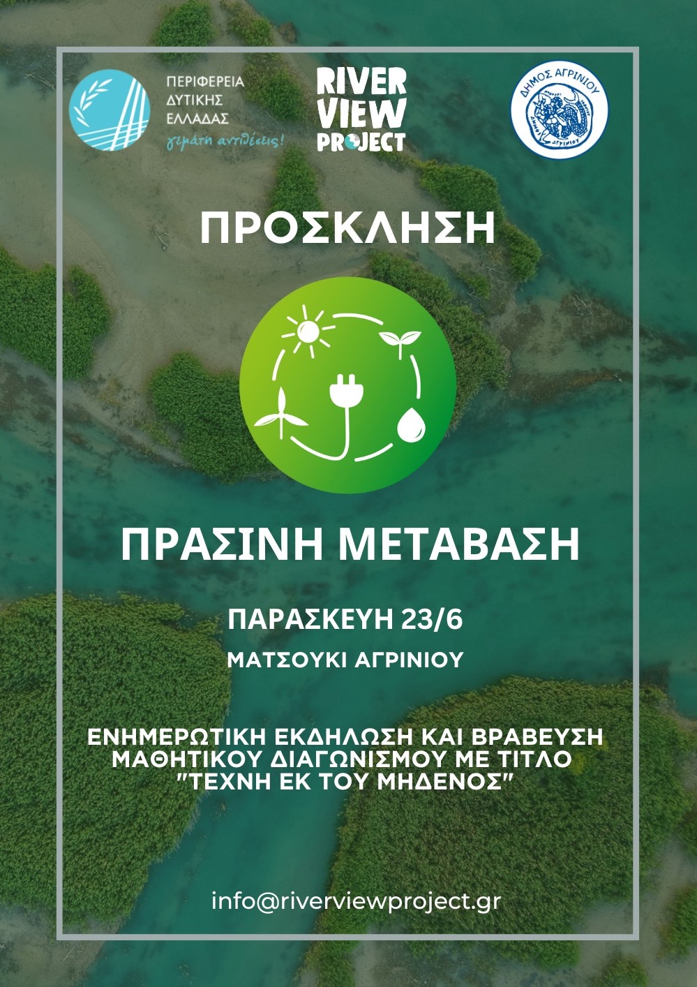20:00 Βράβευση μαθητικού διαγωνισμού “ΤΕΧΝΗ ΕΚ ΤΟΥ ΜΗΔΕΝΟΣ” και ενημερωτική εκδήλωση για την “Πράσινη Μετάβαση”