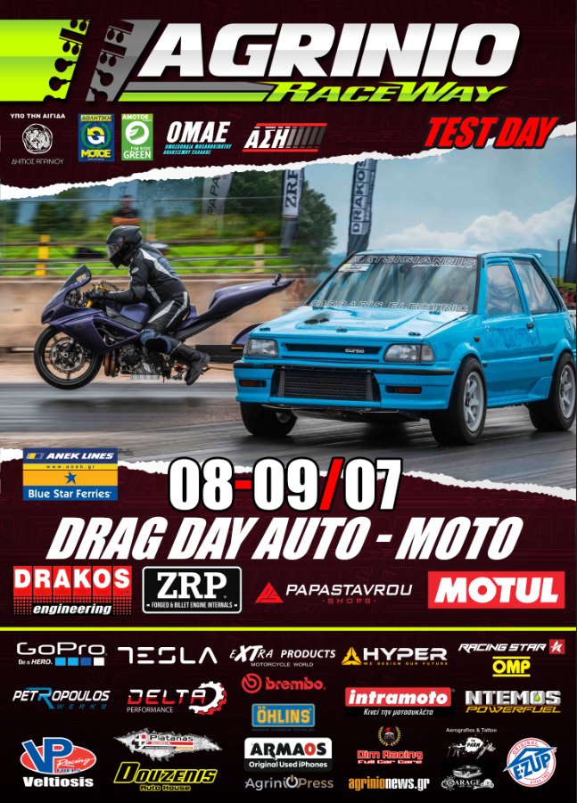 Στην αγωνιστική πίστα Agrinio Raceway στο Στρατιωτικό Αεροδρόμιο Αγρινίου στις 8 και 9 Ιουλίου, ο Αγωνιστικός Σύλλογος Ηρακλείου (ΑΣΗ) μετά από έγκριση της Α.ΜΟΤ.Ο.Ε. θα διοργανώσει Drag Day Dragster, ένα διήμερο με ελεύθερα "περάσματα" για μοτοσυκλέτες και αυτοκίνητα.