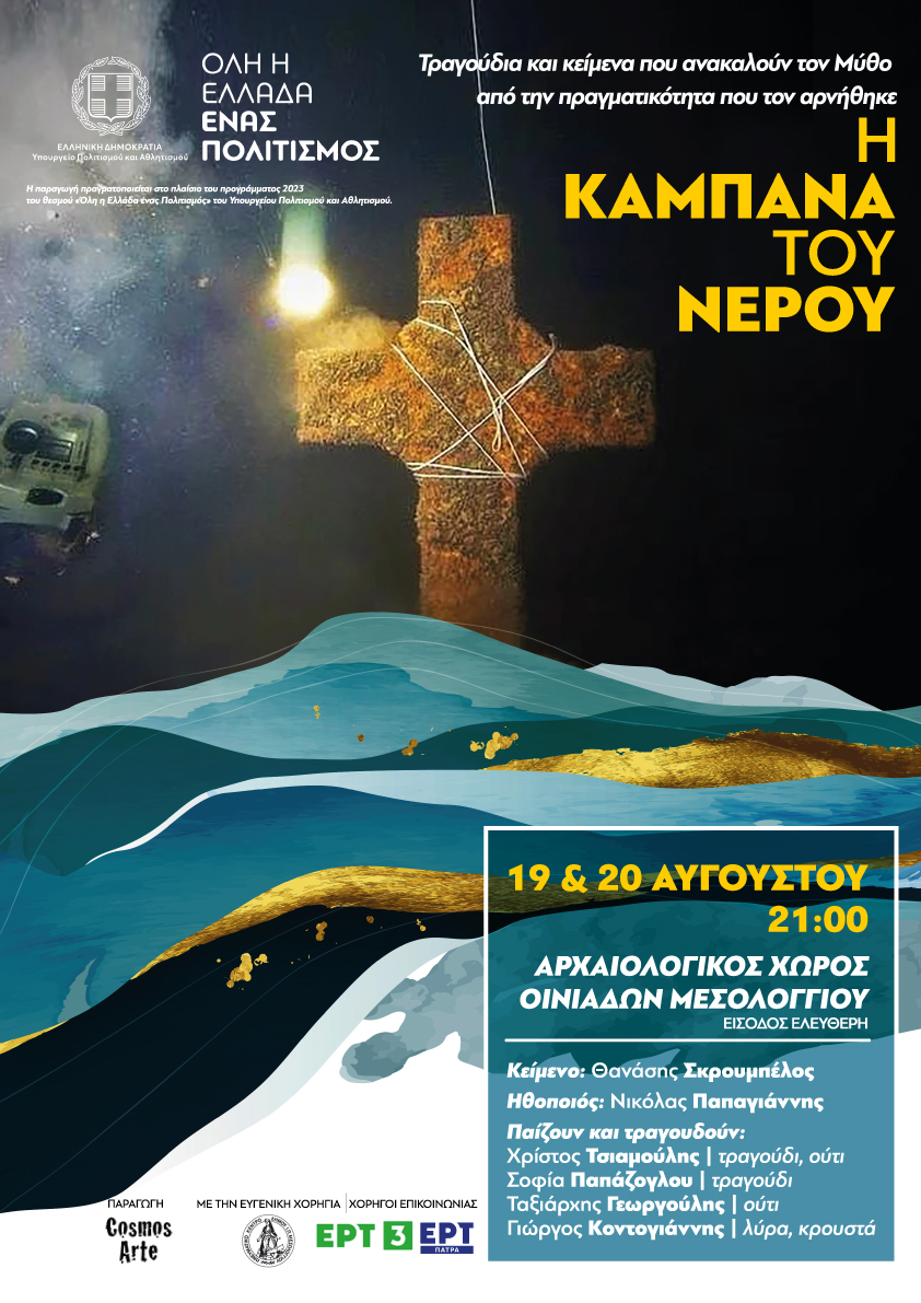 Η ξεχωριστή μουσικοθεατρική παράσταση «Η καμπάνα του νερού» έρχεται στους νεώσοικους του αρχαιολογικού χώρου Οινιαδών Μεσολογγίου για δύο μοναδικές παραστάσεις το Σάββατο 19 και την Κυριακή 20 Αυγούστου, στις 21.00 μ.μ.