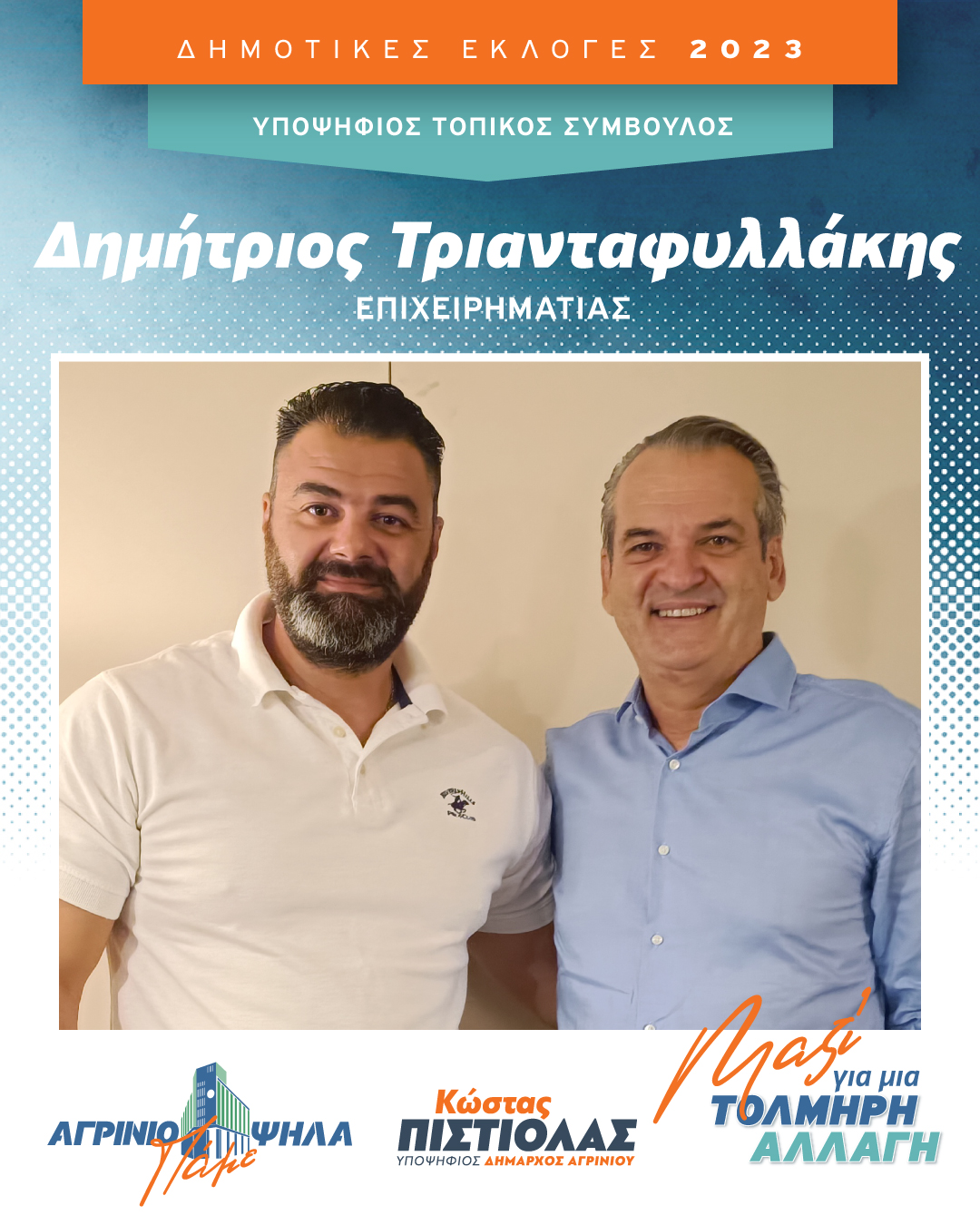 Ο κ. Πιστιόλας ανέφερε συγκεκριμένα: «Καλωσορίζουμε τον Δημήτρη Τριανταφυλλάκη στην κοινή μας προσπάθεια για την τολμηρή αλλαγή στο Δήμο Αγρινίου. Ο Δημήτρης Τριανταφυλλάκης είναι επιχειρηματίας και θα είναι υποψήφιος με το Συνδυασμό μας «Αγρίνιο, Πάμε Ψηλά».