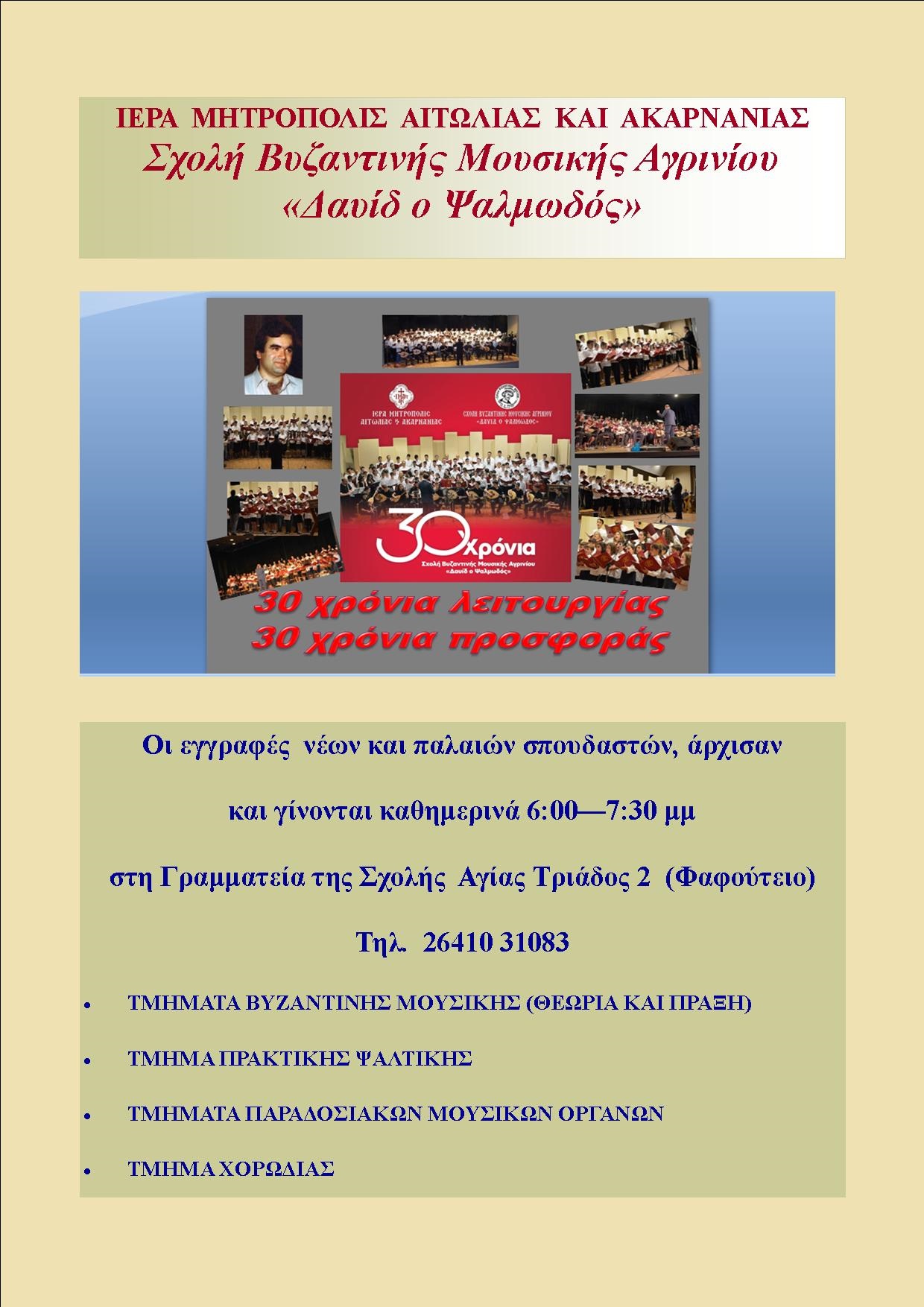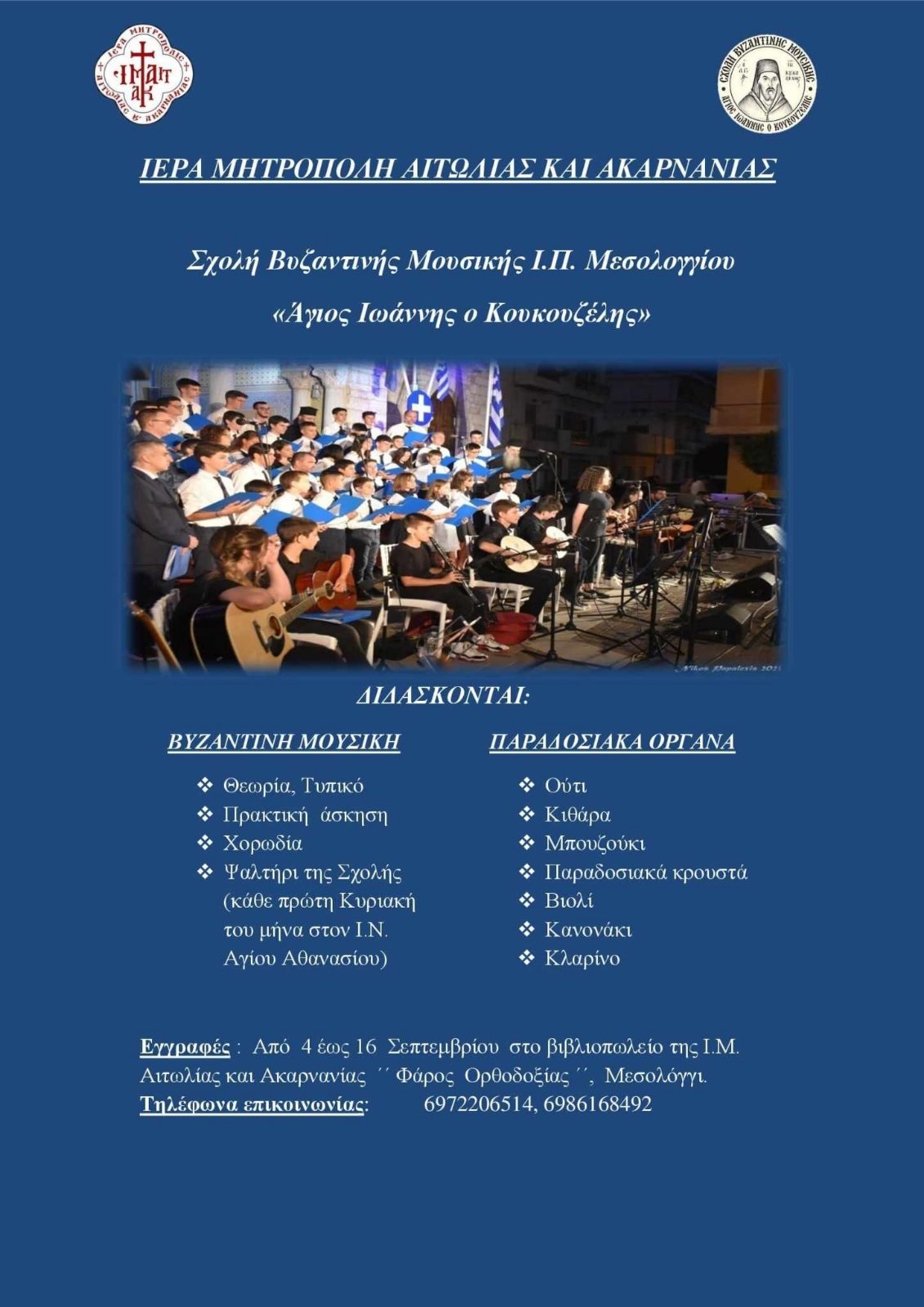 Από την Δευτέρα 4 Σεπτεμβρίου 2023 πραγματοποιούνται οι εγγραφές στις Σχολές Βυζαντινής Μουσικής της Ιεράς Μητροπόλεως Αιτωλίας και Ακαρνανίας στο Μεσολόγγι και στο Αγρίνιο, οι οποίες θα διαρκέσουν μέχρι τέλος Σεπτεμβρίου.