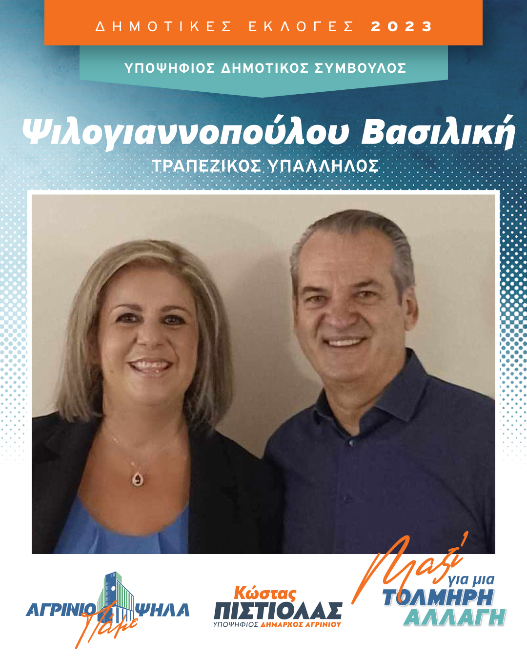 «Καλωσορίζουμε την Βασιλική Ψιλογιαννοπούλου στην κοινή μας προσπάθεια για την τολμηρή αλλαγή στο Δήμο Αγρινίου. Η Βασιλική Ψιλογιαννοπούλου είναι τραπεζική υπάλληλος και θα είναι υποψήφια με το Συνδυασμό μας «Αγρίνιο, Πάμε Ψηλά». Βασιλική, καλό μας αγώνα και καλή επιτυχία!