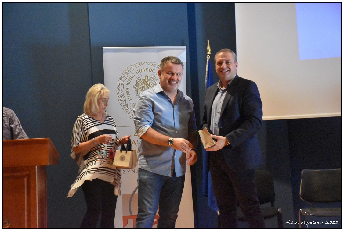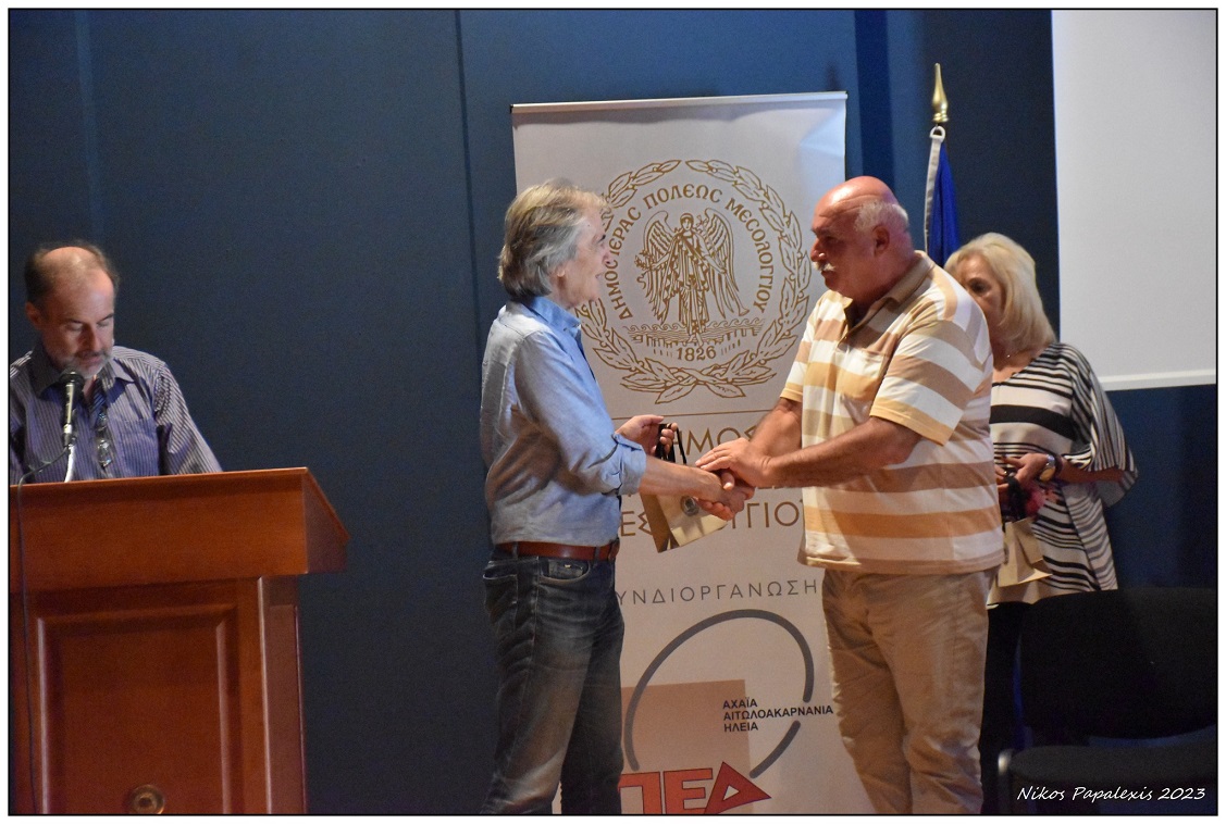 Ενώ ακολούθησε και η επίδοση αναμνηστικών στους εισηγητές από τον Αντιδήμαρχο Οικονομικών του Δήμου Ι.Π. Μεσολογγίου Νίκο Καραπάνο και τον Πρόεδρο του Πνευματικού Κέντρου του δήμου, Νίκο Χαντζή.