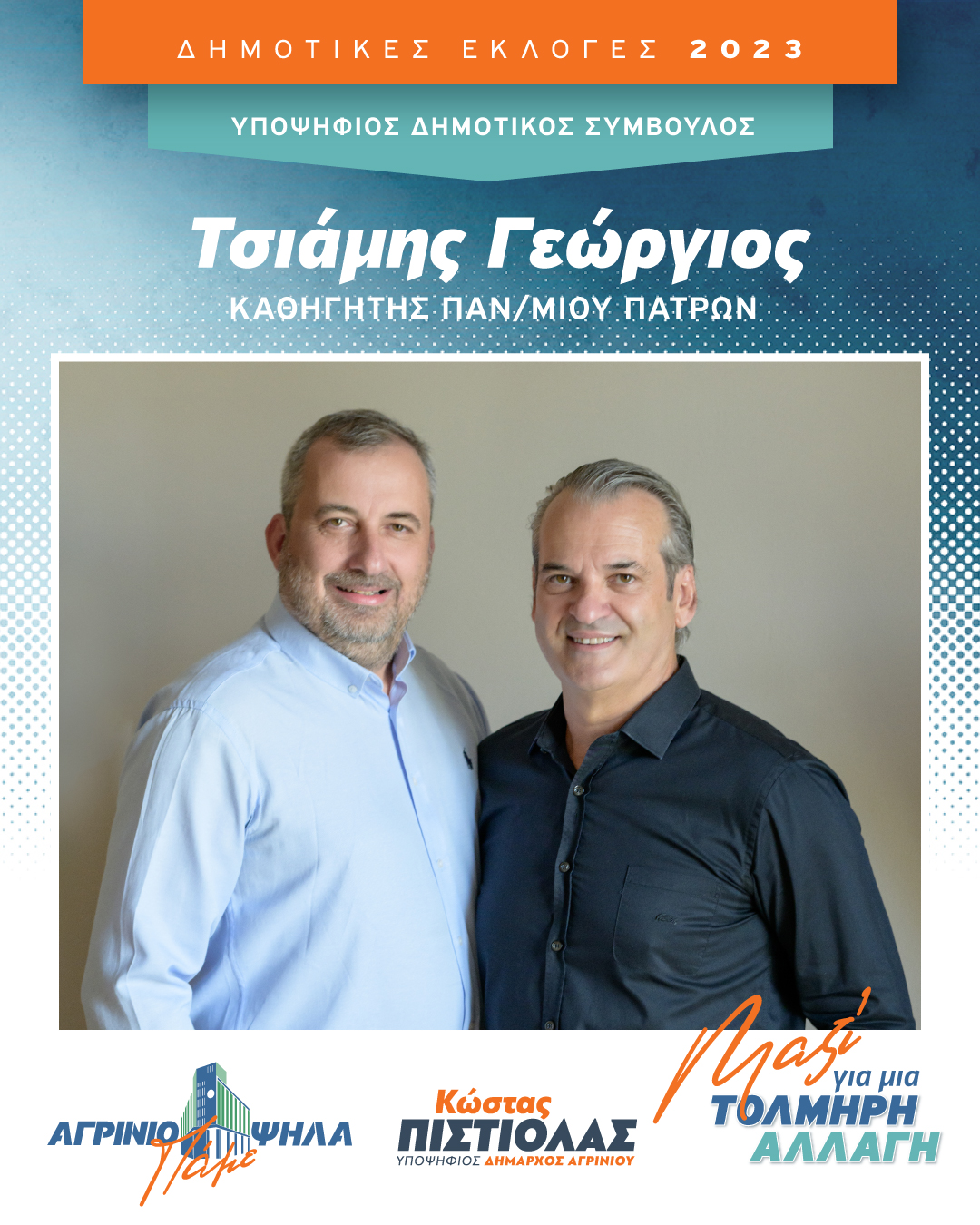 Ο Γεώργιος Τσιάμης, Καθηγητής στο Τμήμα Αειφορικής Γεωργίας του Πανεπιστημίου Πατρών (Αγρίνιο) κατέρχεται στις δημοτικές εκλογές ως υποψήφιος Δημοτικός Σύμβουλος με τον συνδυασμό του Κώστα Πιστιόλα «Αγρίνιο Πάμε Ψηλά».