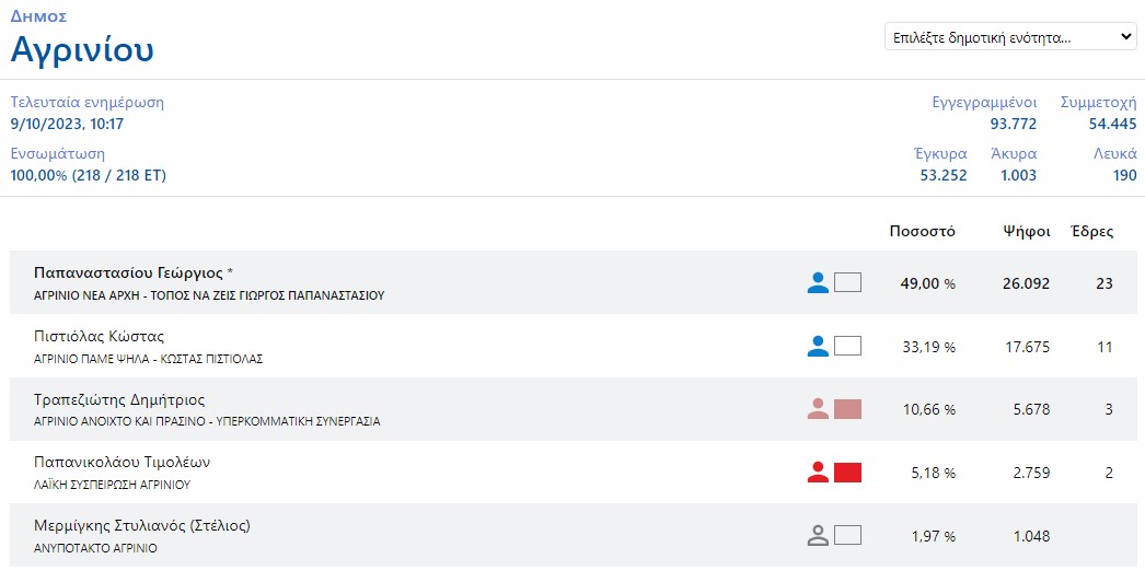 Τελικά αποτελέσματα στον Δήμο Αγρινίου