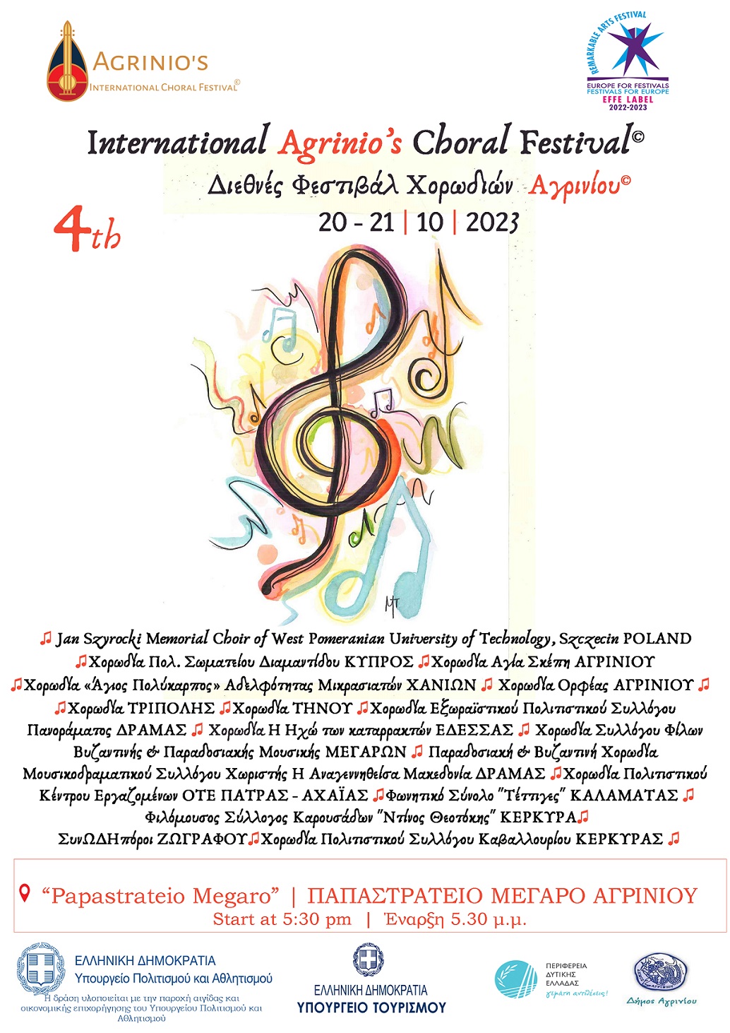 Για 4η συνεχή χρονιά θα διεξαχθεί την Παρασκευή 20 και το Σάββατο 21 Οκτωβρίου 2023, στο Παπαστράτειο Μέγαρο, το Διεθνές Φεστιβάλ Χορωδιών Αγρινίου, το οποίο τελεί υπό την αιγίδα του Υπουργείου Πολιτισμού και Υπουργείου Τουρισμού, καθώς και του Δήμου Αγρινίου και της Περιφέρειας Δυτικής Ελλάδος.