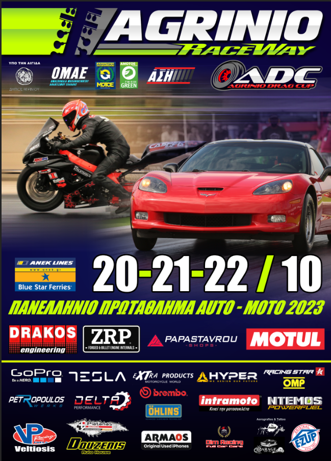 Στην αγωνιστική πίστα «Agrinio Raceway» στο στρατιωτικό αεροδρόμιο Αγρινίου το τριήμερο 20-21 και 22 Οκτωβρίου θα διεξαχθεί ο 5ος και πιο δυνατός αγώνας για το Πανελλήνιο πρωτάθλημα Dragster αυτοκινήτων και μοτοσυκλετών του 2023!
