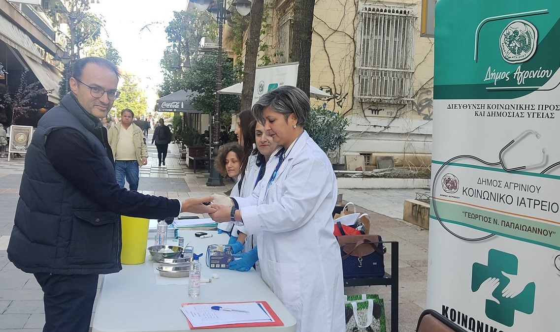Με αφορμή την 14η Νοέμβρη, την Παγκόσμια Ημέρα Διαβήτη, σήμερα το Νοσηλευτικό προσωπικό του Κοινωνικού Ιατρείου και του Κοινωνικού Φαρμακείου και με την συνδρομή της Δομής Αστέγων της Διεύθυνσης Κοινωνικής Προστασίας και Δημόσιας Υγείας, του Δήμου Αγρινίου, πραγματοποίησε με μεγάλη επιτυχία δωρεάν μέτρηση σακχάρου σε 260 συμπολίτες μας στον πεζόδρομο της Χαρίλαου Τρικούπη (είσοδο Δημαρχείου).