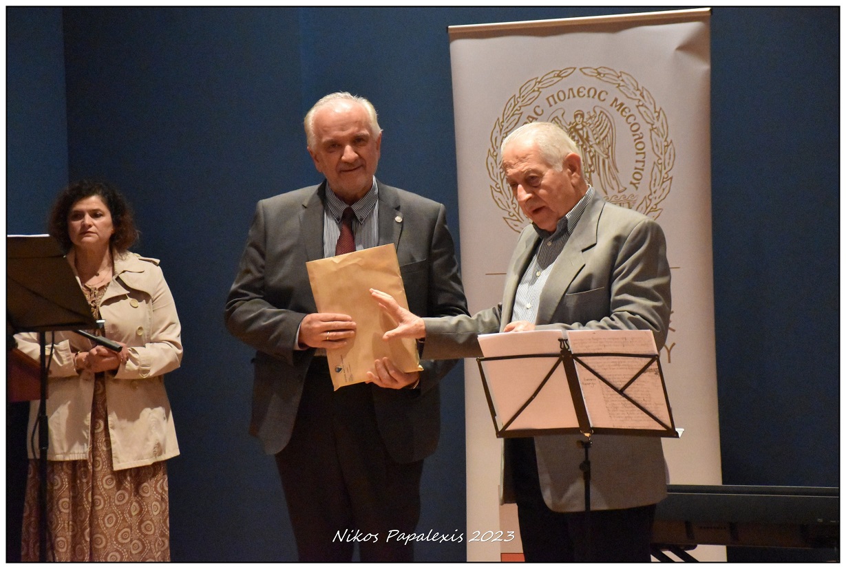 Χαιρετισμούς απηύθηναν οι, Κώστας Λύρος, Δήμαρχος του Δήμου Ιεράς Πόλεως Μεσολογγίου και ο Κωνσταντίνος Κασίνης, Πρόεδρος του Ιδρύματος Κωστή Παλαμά.