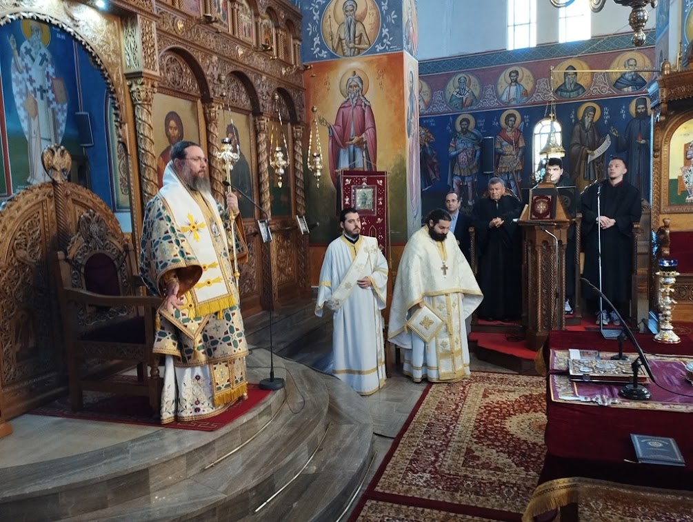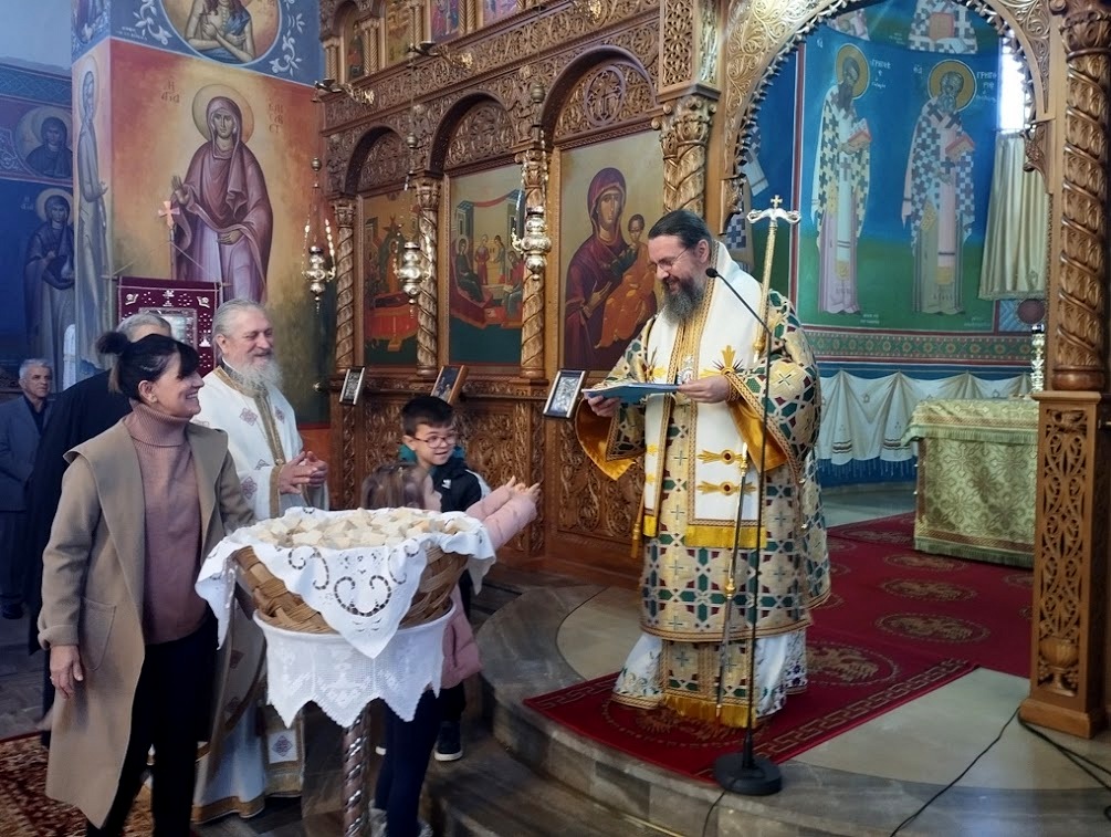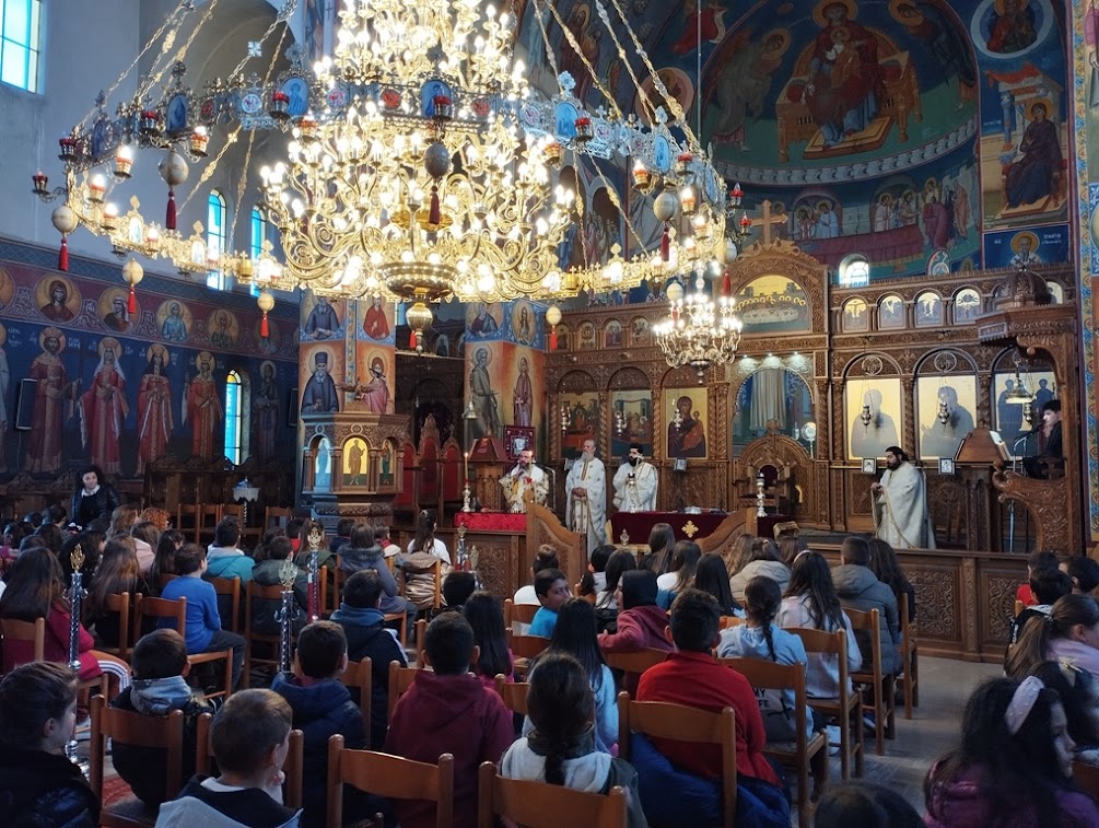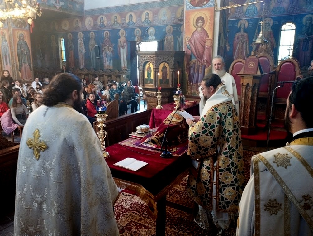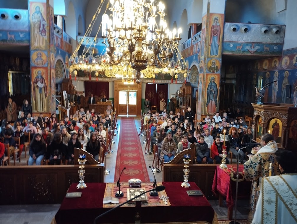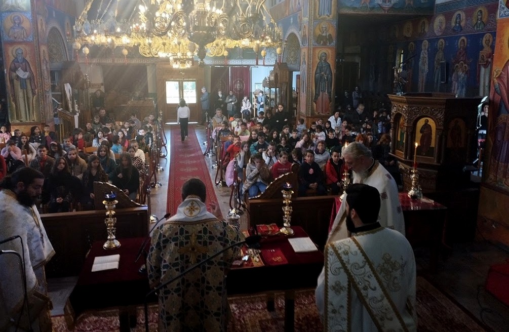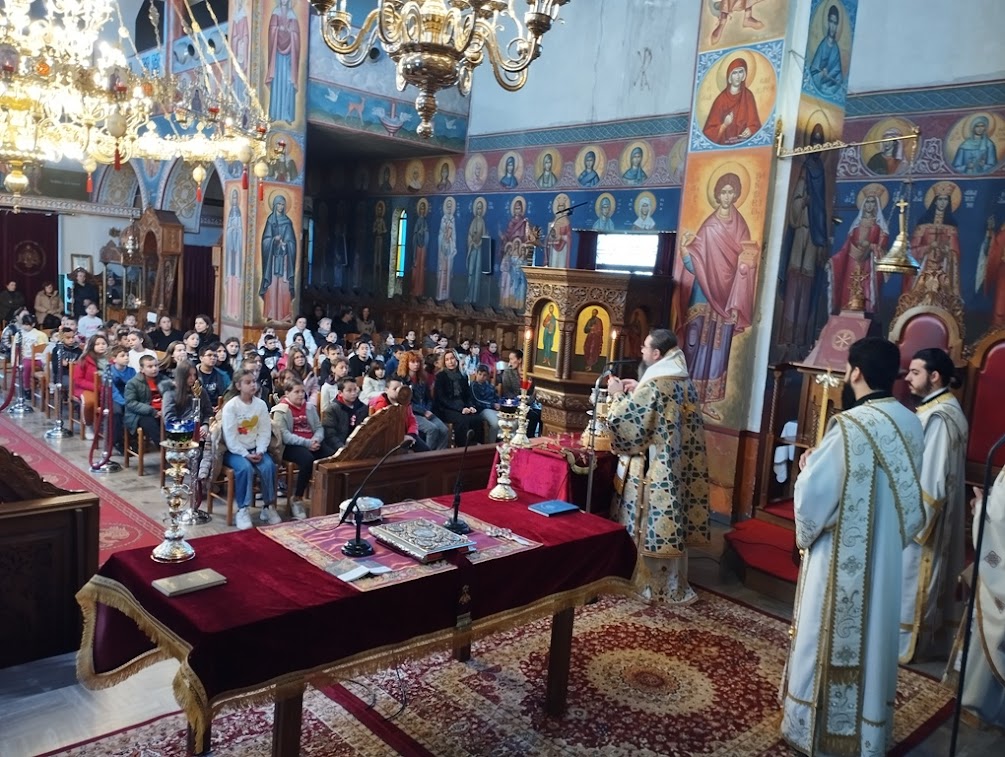 Κατά την Θεία Λειτουργία που τελέστηκε στον σολέα του Ναού (χώρος σε έναν ναό που βρίσκεται ανάμεσα στον άμβωνα και το τέμπλο) ο Σεβασμιώτατος επεξηγούσε με απλά λόγια τα τελούμενα, τα βασικά σημεία και τους συμβολισμούς της Θείας Λειτουργίας, με σκοπό οι μικροί μαθητές να μπορέσουν να συμμετέχουν και να βιώσουν το ιερό Μυστήριο.