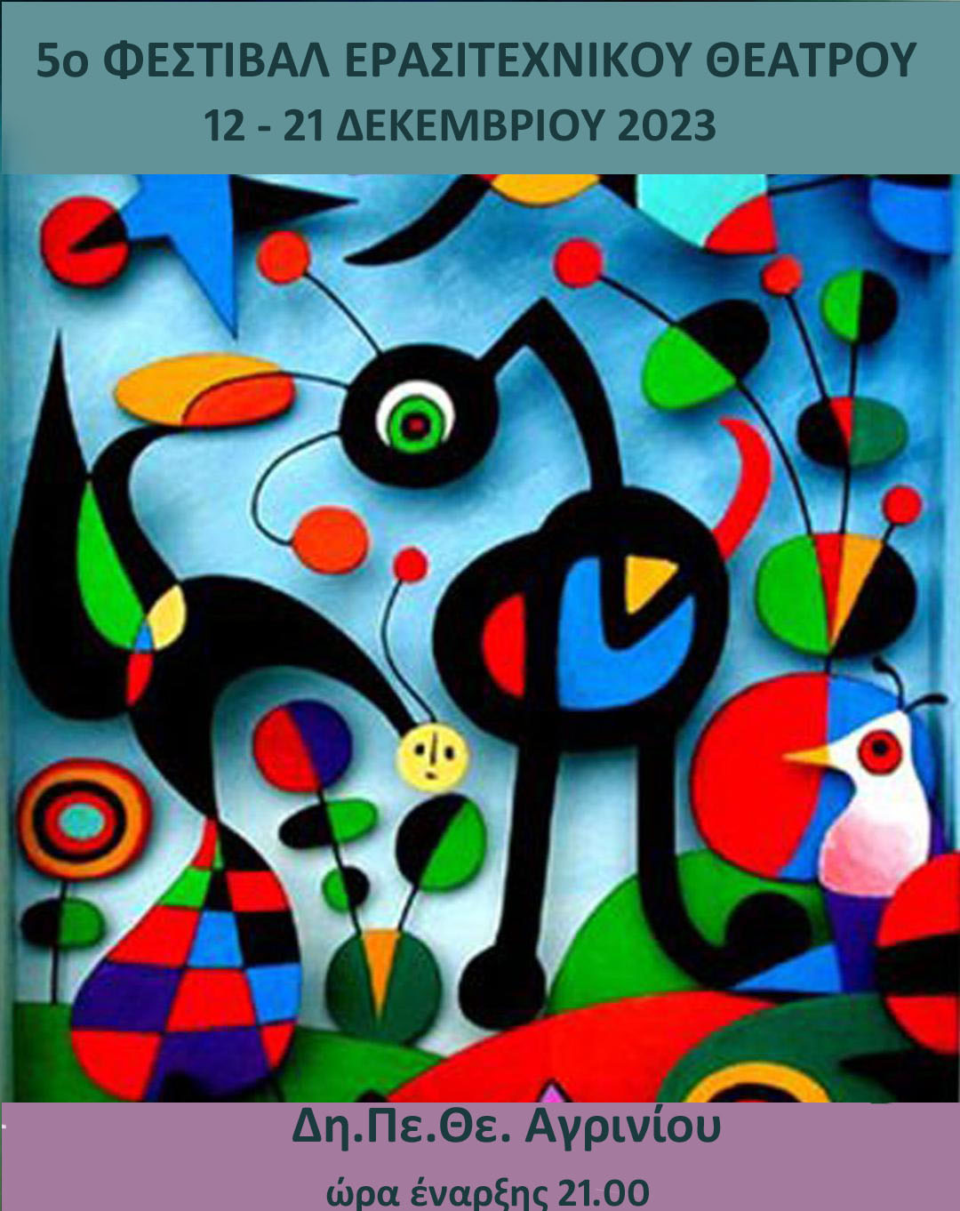 Το Δη.Πε.Θε. Αγρινίου διοργανώνει, για πέμπτη χρονιά, το Φεστιβάλ Ερασιτεχνικού Θεάτρου το οποίο θα λάβει χώρα στην αίθουσα του Δημοτικού Περιφερειακού Θεάτρου από 12 Δεκεμβρίου έως 21 Δεκεμβρίου 2023, με είσοδο ελεύθερη.