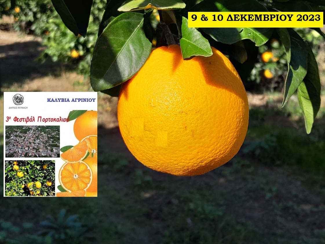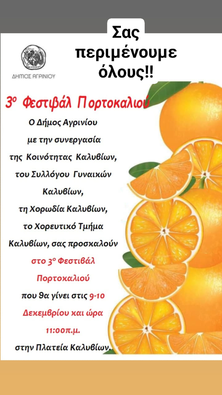 Ο Δήμος Αγρινίου σε συνεργασία με το Τοπικό Συμβούλιο Καλυβίων, σας προσκαλούν να συμμετάσχετε στο 3ο Φεστιβάλ Πορτοκαλιού που θα πραγματοποιηθεί στην Κοινότητα Καλυβίων, στις 9 και 10 Δεκεμβρίου 2023.