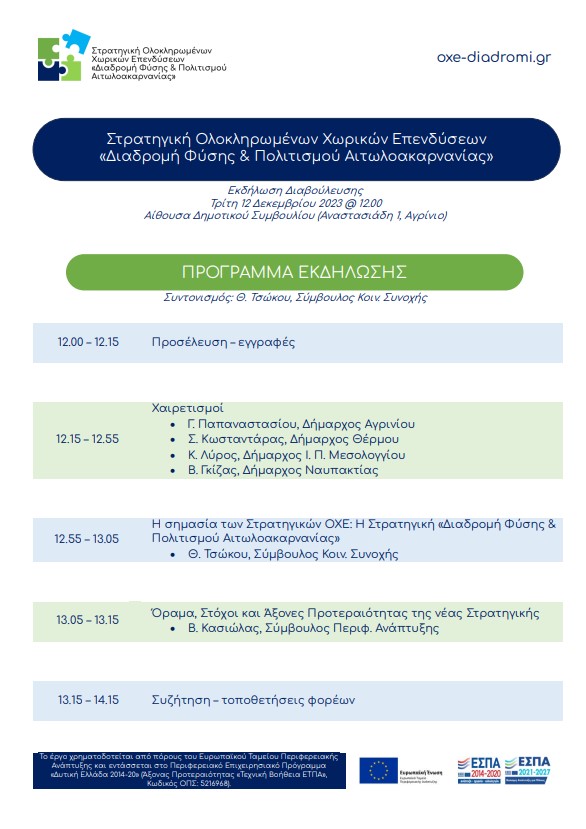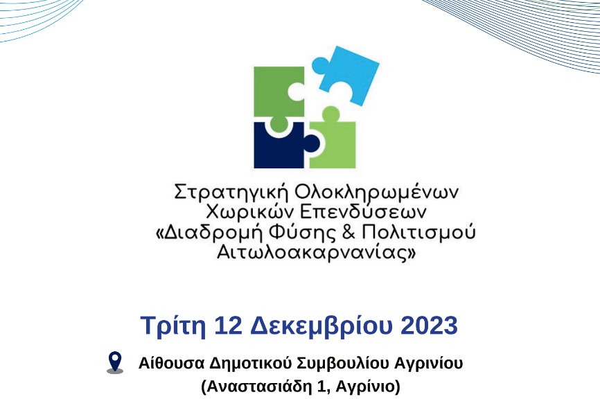 Στο πλαίσιο εκπόνησης της Στρατηγικής Ολοκληρωμένων Χωρικών Επενδύσεων "Διαδρομή Φύσης και Πολιτισμού Αιτωλοακαρνανίας", στο οποίο συμμετέχουν οι Δήμοι Αγρινίου, Θέρμου, Ι.Π. Μεσολογγίου και Ναυπακτίας, θα πραγματοποιηθεί εκδήλωση διαβούλευσης, την Τρίτη 12 Δεκεμβρίου και ώρα 12.00 στην αίθουσα Δημοτικού Συμβουλίου Αγρινίου (Αναστασιάδη 1, Αγρίνιο).