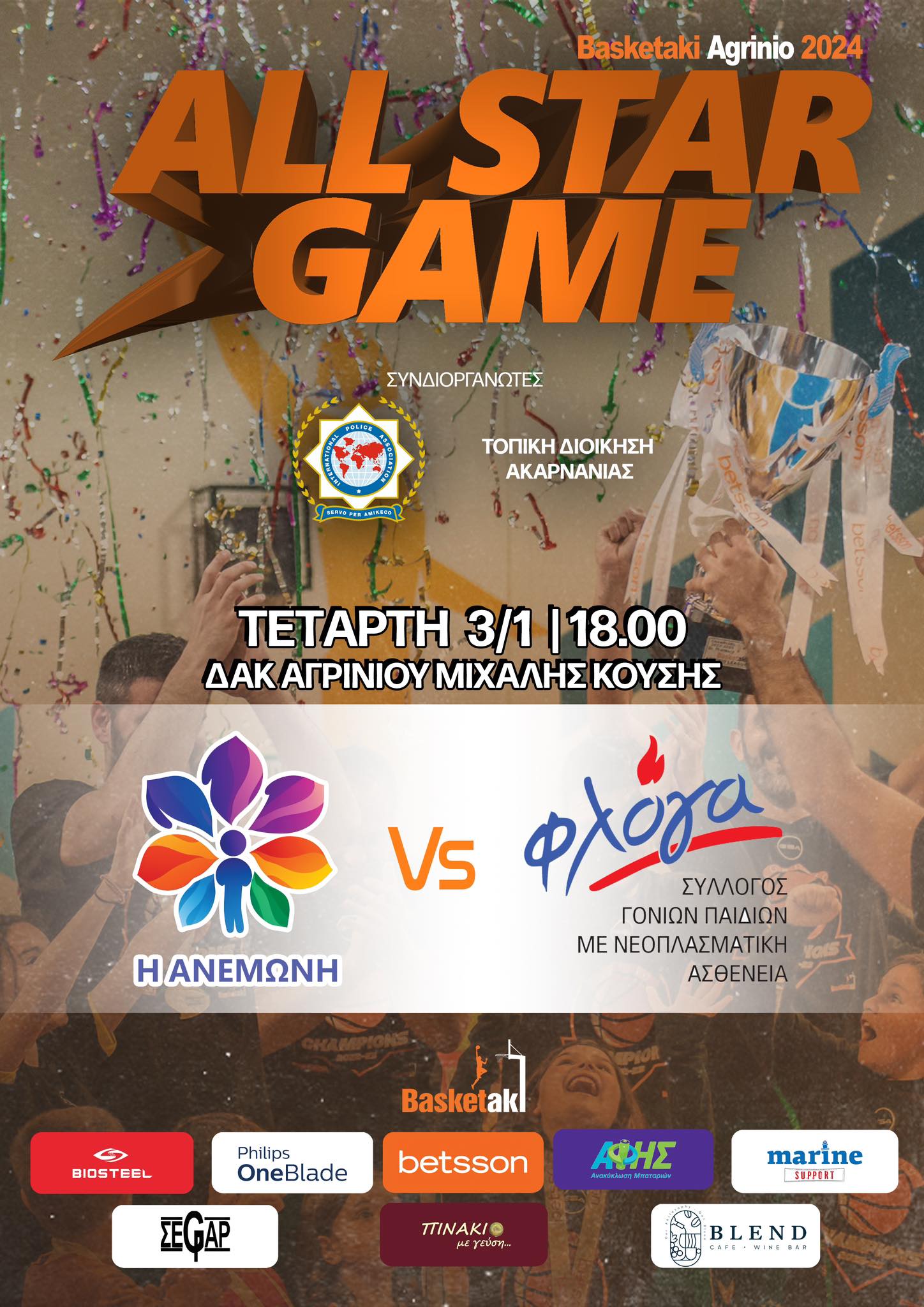 Ο αγώνας θα πραγματοποιηθεί στο κλειστό γήπεδο μπάσκετ του Δ.Α.Κ Αγρινίου στις 18:00. Θα λάβουν μέρος δύο ομάδες που θα σχηματιστούν από τους καλύτερους παίκτες του πρωταθλήματος Basketaki. Η μια ομάδα θα λάβει το όνομα ΑΝΕΜΩΝΗ και η άλλη το όνομα ΦΛΟΓΑ. Ο αγώνας θα είναι αφιερωμένος στους δυο αντίστοιχους συλλόγους της περιοχής μας που ο ένας στηρίζει τα παιδιά με αυτισμό και ο άλλος τα παιδιά με καρκίνο.