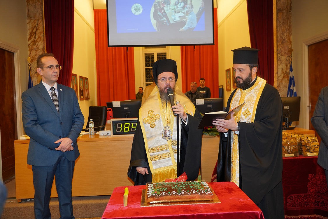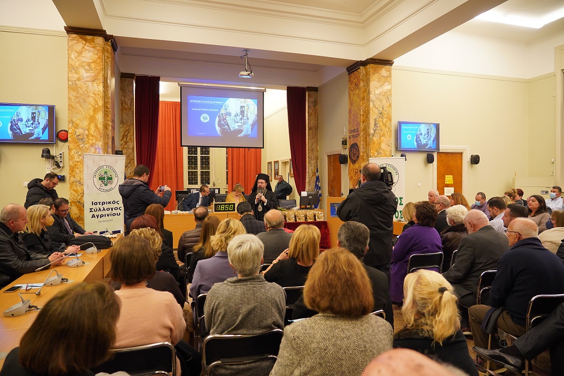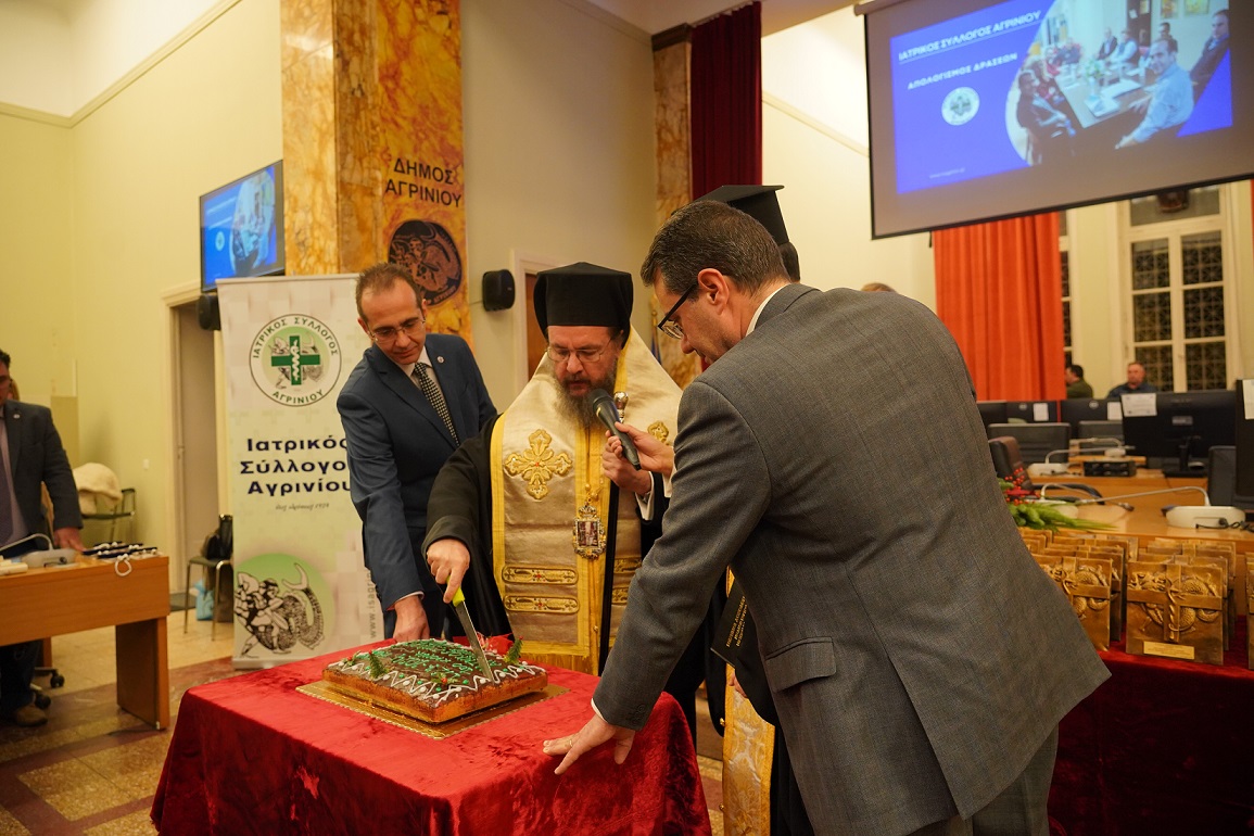 Ο Σεβασμιώτατος Μητροπολίτης Αιτωλίας και Ακαρνανίας κατά την σύντομη προσφώνησή του εξέφρασε τη χαρά του για την παρουσία του ανάμεσα στους Ιατρούς της πόλης, τονίζοντας, ότι την φετινή χρονιά συμπληρώνονται 100 χρόνια από την ίδρυση του Συλλόγου, τον οποίο διαχρονικά υπηρέτησαν μεγάλες ιατρικές προσωπικότητες που έθεσαν γερά θεμέλια πάνω στα οποία συνεχίζουν οι νεώτεροι. Ευχήθηκε σε όλους, με τη δύναμη της ιατρικής επιστήμης και της πίστης στον Θεό να αντιμετωπίζουν τις σωματικές και πνευματικές ασθένειες, αφού ο άνθρωπος είναι ενιαία ψυχοσωματική οντότητα και τόνισε, ότι και η Εκκλησία, που είναι ένα πνευματικό θεραπευτήριο και η ιατρική επιστήμη διακονούν, προασπίζουν και προστατεύουν το αγαθό της ζωής που είναι το μέγιστο δώρο του Θεού προς τον άνθρωπο.
