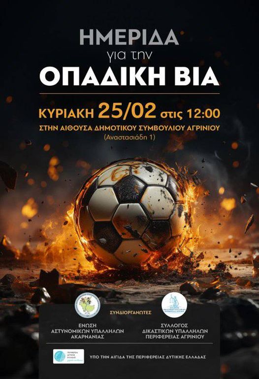 Μια σημαντική και επίκαιρη ημερίδα με θέμα την οπαδική βία, διοργανώνει ο Σύλλογος Δικαστικών Υπαλλήλων Περιφέρειας Αγρινίου και η Ένωση Αστυνομικών Υπαλλήλων Ακαρνανίας, την Κυριακή 25 Φεβρουαρίου στις 12 το μεσημέρι, στην αίθουσα συνεδριάσεων του Δημοτικού Συμβουλίου του Δήμου Αγρινίου.