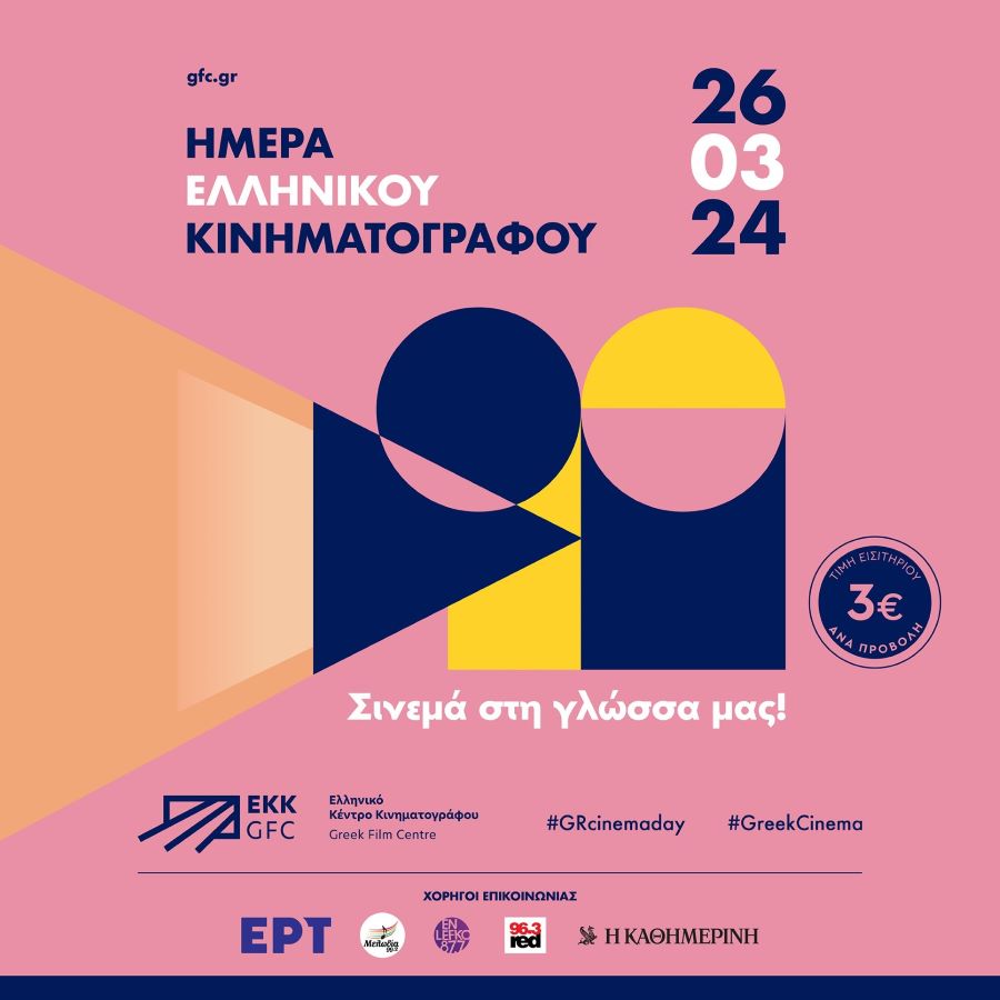 Το σύνολο της ελληνικής παραγωγής των τελευταίων τεσσάρων ετών θα είναι προσβάσιμο στις κινηματογραφικές αίθουσες της επικράτειας, τον φυσικό χώρο της κινηματογραφικής ταινίας, με τιμή εισιτηρίου 3 €, χάρη στη δράση «Ημέρα Ελληνικού Κινηματογράφου» στις 26 Μαρτίου 2024.