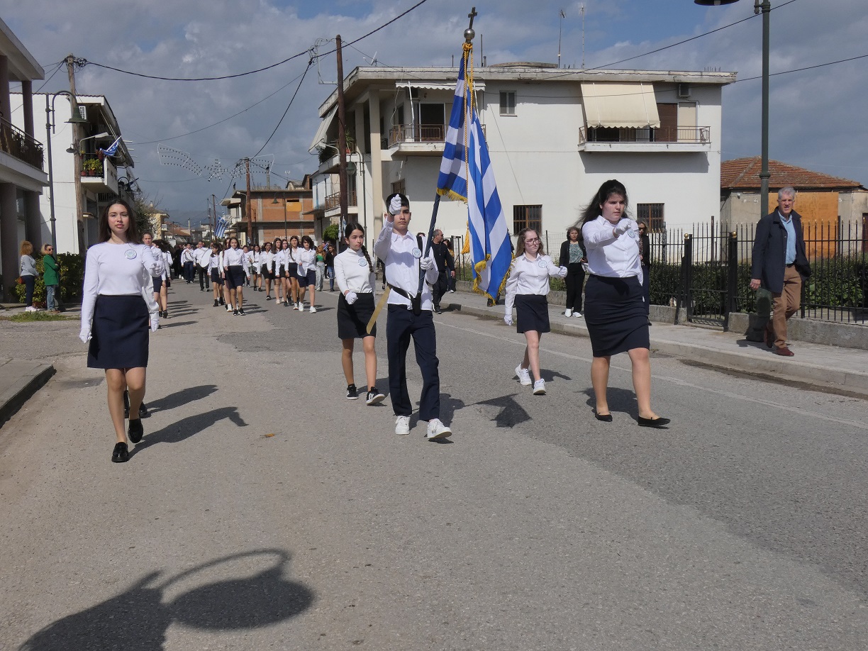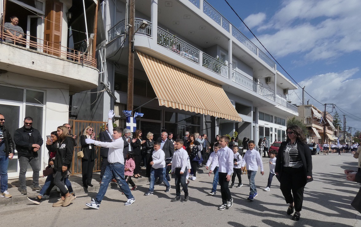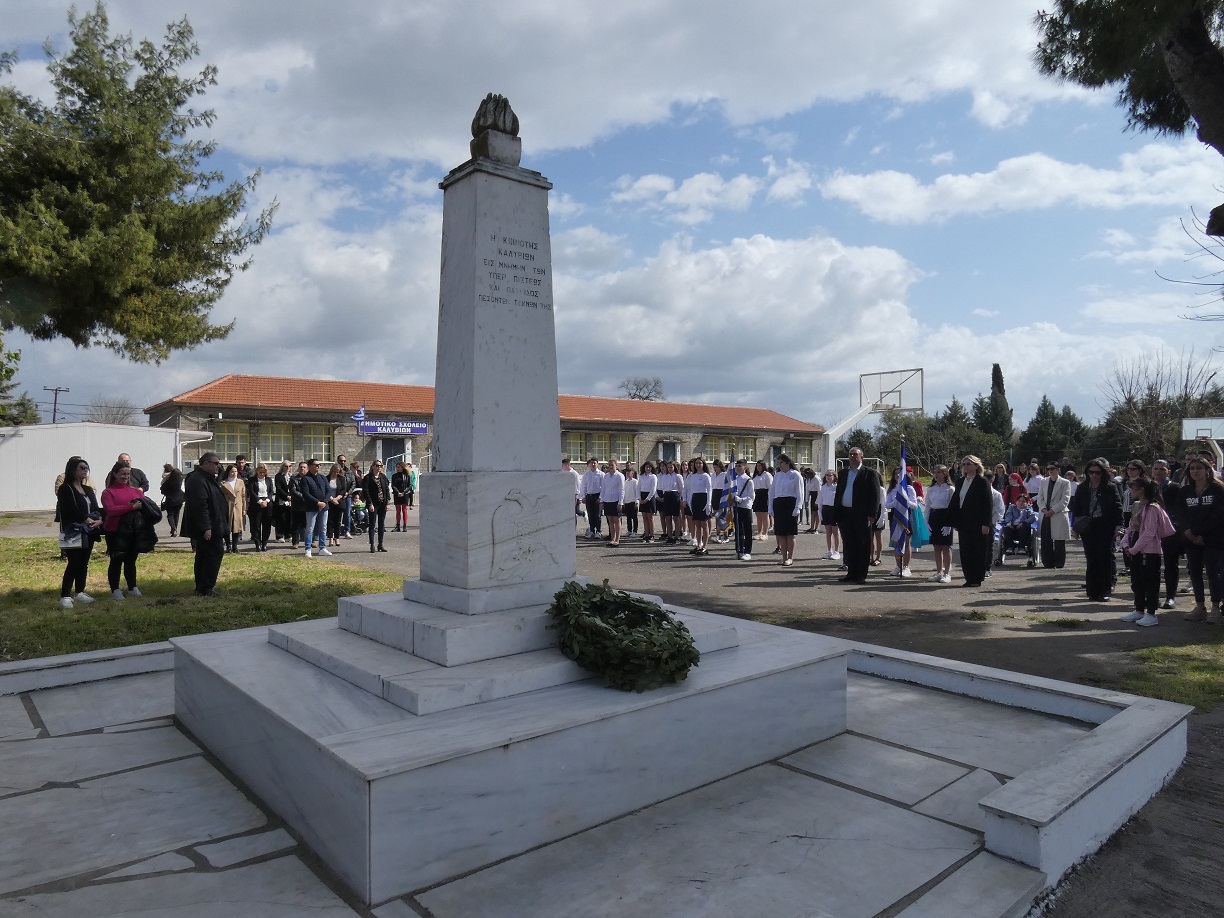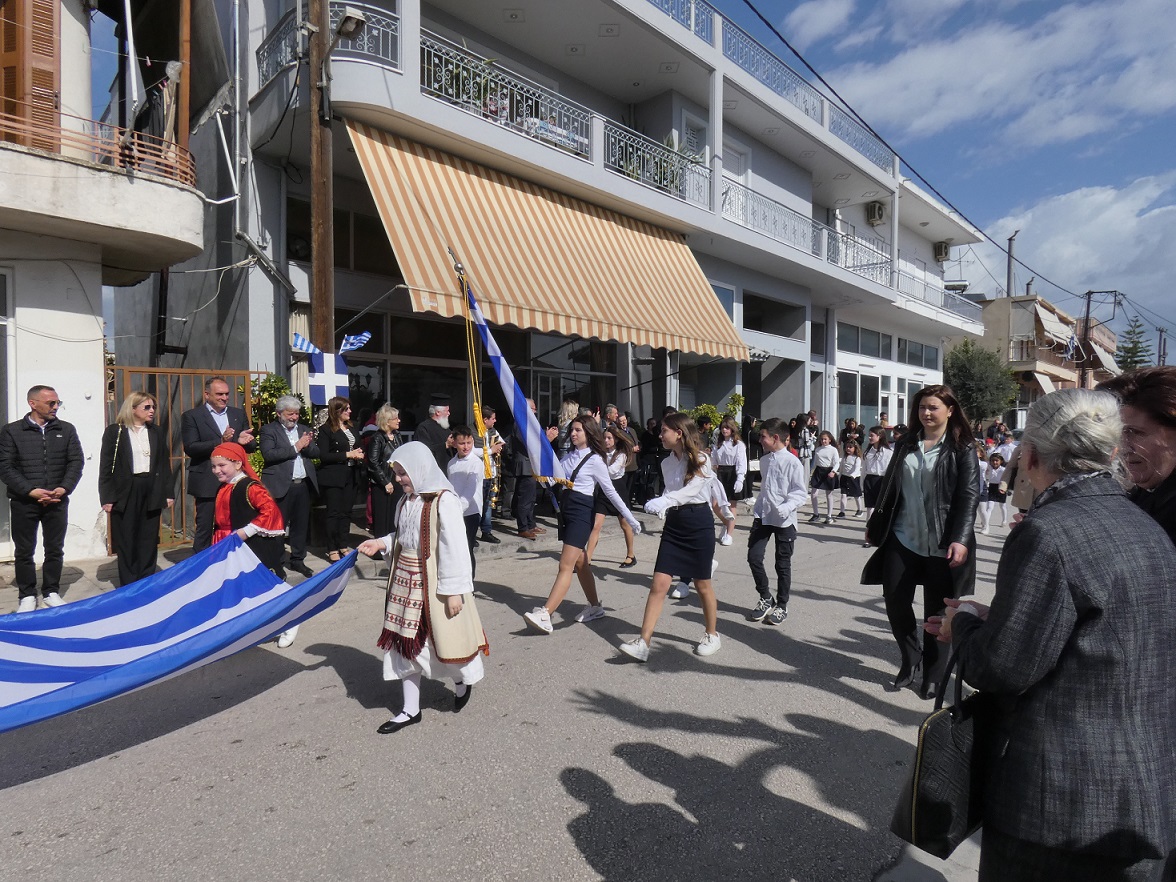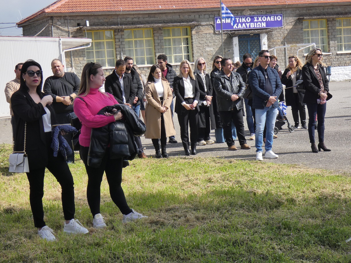 Αμέσως μετά, στους κεντρικούς δρόμους του χωριού μας, οι κάτοικοι παρακολούθησαν και χειροκρότησαν την παρέλαση των μαθητών του Νηπιαγωγείου, του Δημοτικού Σχολείου και του Γυμνασίου Καλυβίων, για να ολοκληρωθεί η πορεία στο Μνημείο των Πεσόντων, όπου τελέσθηκε η επιμνημόσυνη δέηση για τους πεσόντες υπέρ Πατρίδος.