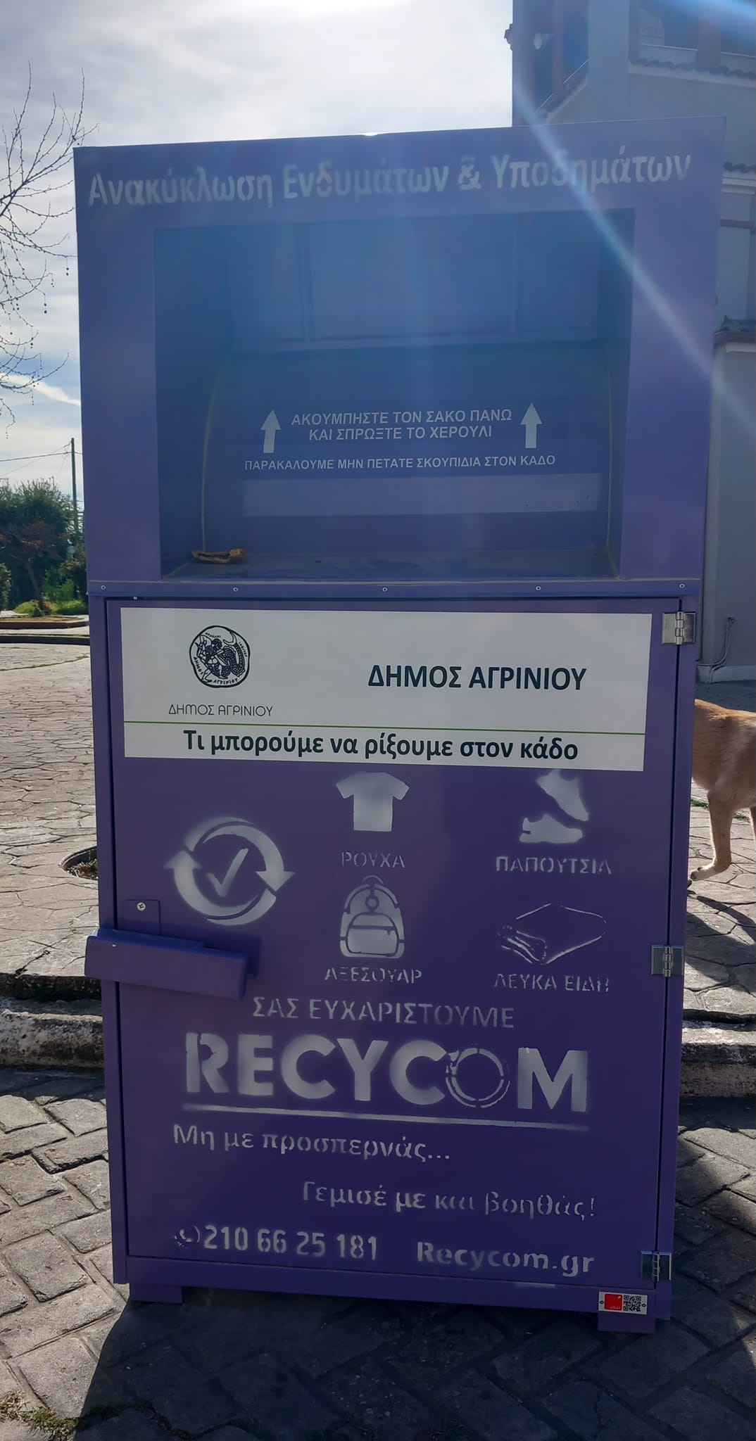 Αντίστοιχα και σε άλλες δημοτικές κοινότητες του δήμου Αγρινίου τοποθετήθηκαν κάδοι, προκειμένου οι πολίτες να πηγαίνουν και να αποθέτουν εκεί τα ρούχα ή τα παπούτσια που δεν χρειάζονται.