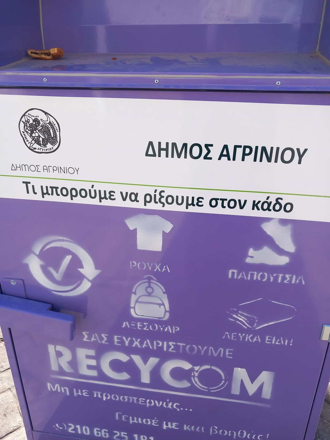 Ένας μοβ κάδος ανακύκλωσης ενδυμάτων και υποδημάτων τοποθετήθηκε στην κεντρική πλατεία του χωριού μας, από τον δήμο Αγρινίου σε συνεργασία με ιδιωτική εταιρεία ανακύκλωσης και κατόπιν συννενόησης με την Κοινότητα Καλυβίων.