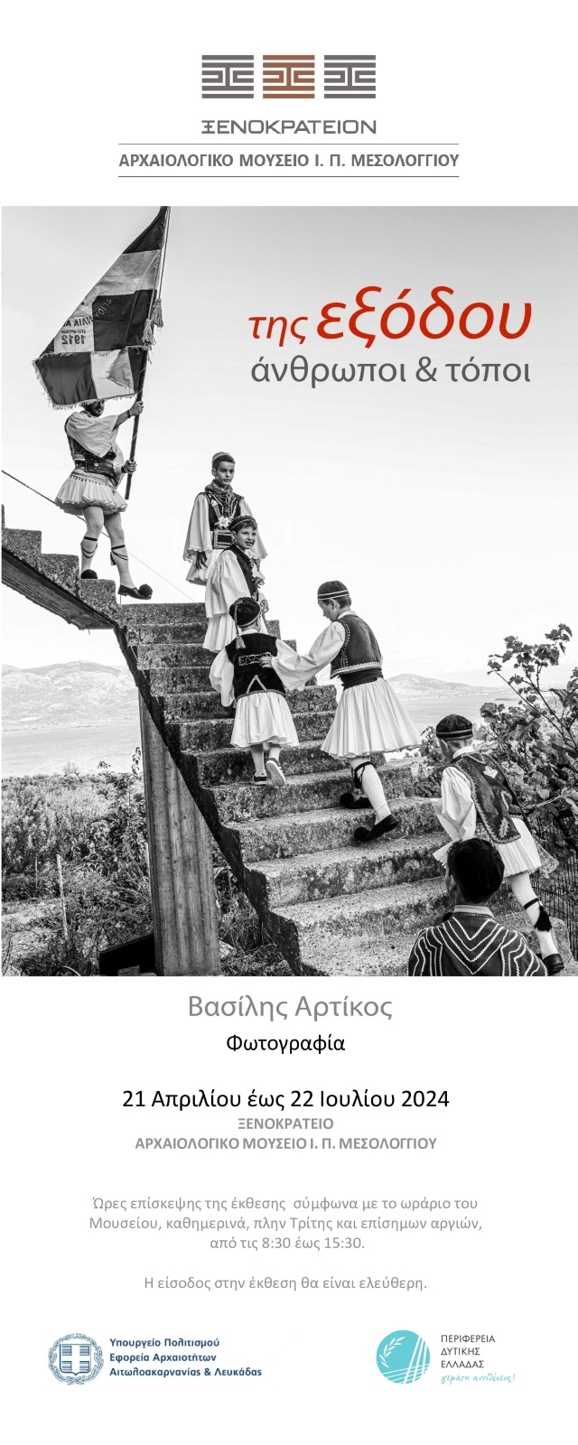 Η Εφορεία Αρχαιοτήτων Αιτωλοακαρνανίας και Λευκάδας, σε συνεργασία με την Περιφέρεια Δυτικής Ελλάδας, διοργανώνει την περιοδική έκθεση φωτογραφίας του Βασίλη Αρτίκου με θέμα «Της Εξόδου… Άνθρωποι και Τόποι», η οποία θα παρουσιαστεί στο Ξενοκράτειο Αρχαιολογικό Μουσείο στο Μεσολόγγι.