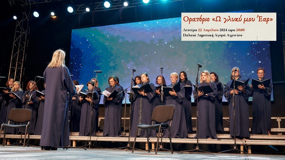 Την Δευτέρα 22 Απριλίου 2024 και ώρα 20:00 στην Παλαιά Δημοτική Αγορά Αγρινίου θα λάβει χώρα το Ορατόριο «Ω Γλυκύ μου Έαρ» μέρος της δράσης Psaltica Musica Byzantina© της Χορωδίας Αγία Σκέπη Αγρινίου.